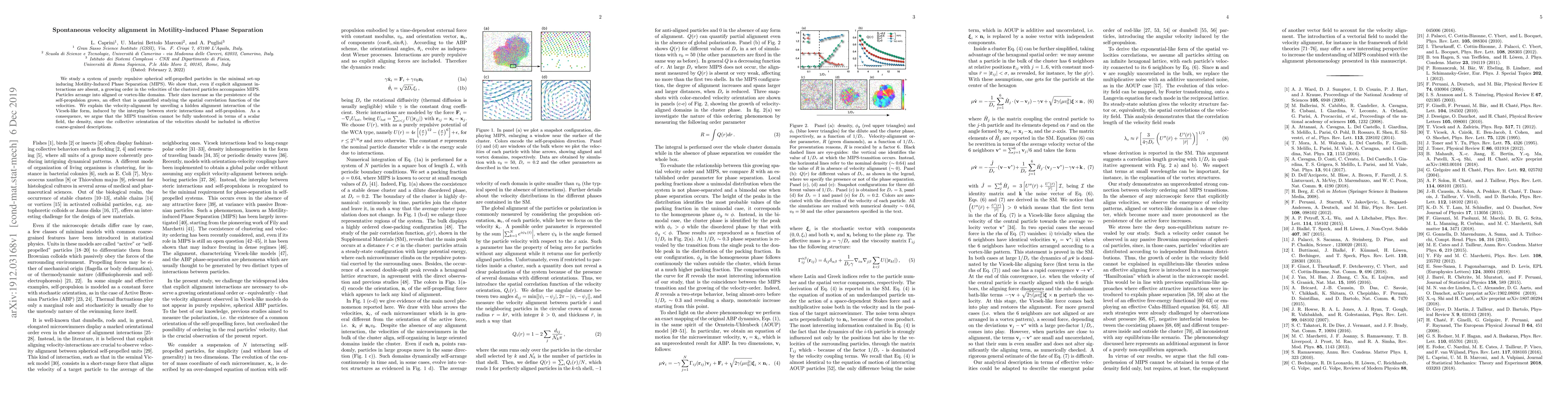 This research investigates a system of self-propelled particles leading to Motility-Induced Phase Separation (MIPS), revealing spontaneous velocity alignment even without explicit alignment interactions. The study finds that velocity alignment arises from hidden interactions induced by steric forces and self-propulsion, impacting the transition dynamics beyond density considerations.