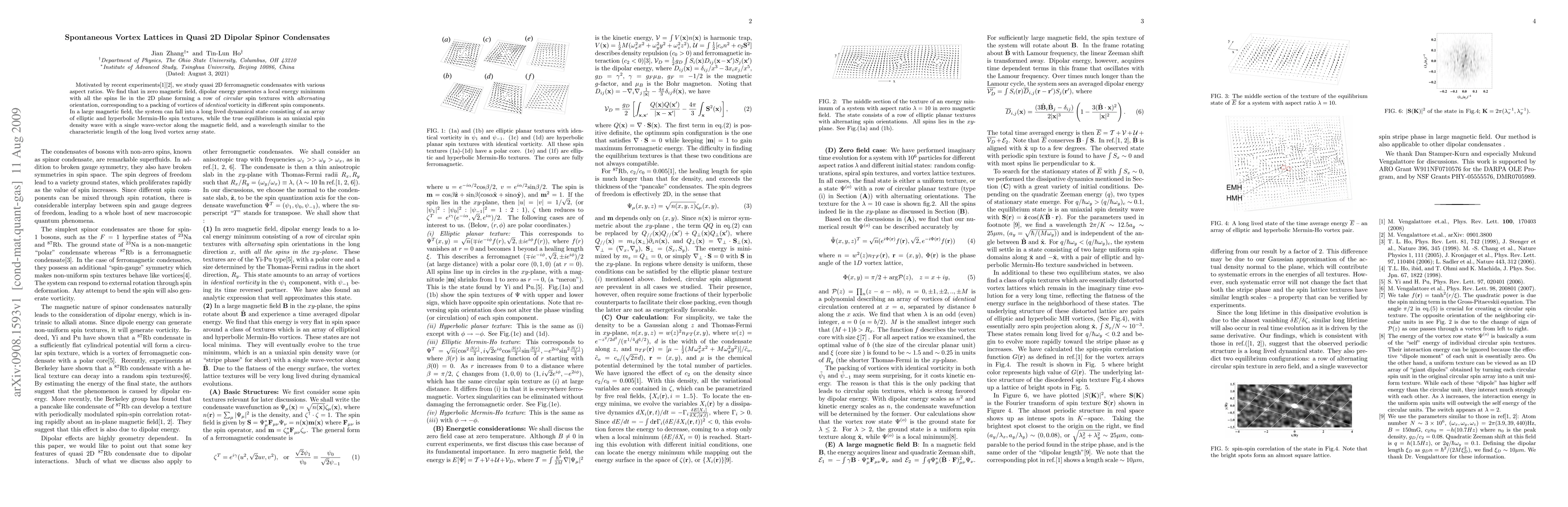 Researchers found that dipolar energy creates a unique vortex lattice in 2D ferromagnetic condensates with alternating spin textures, even without an external magnetic field. The system can transition to a long-lived dynamic state with elliptic and hyperbolic spin textures under strong magnetic fields.