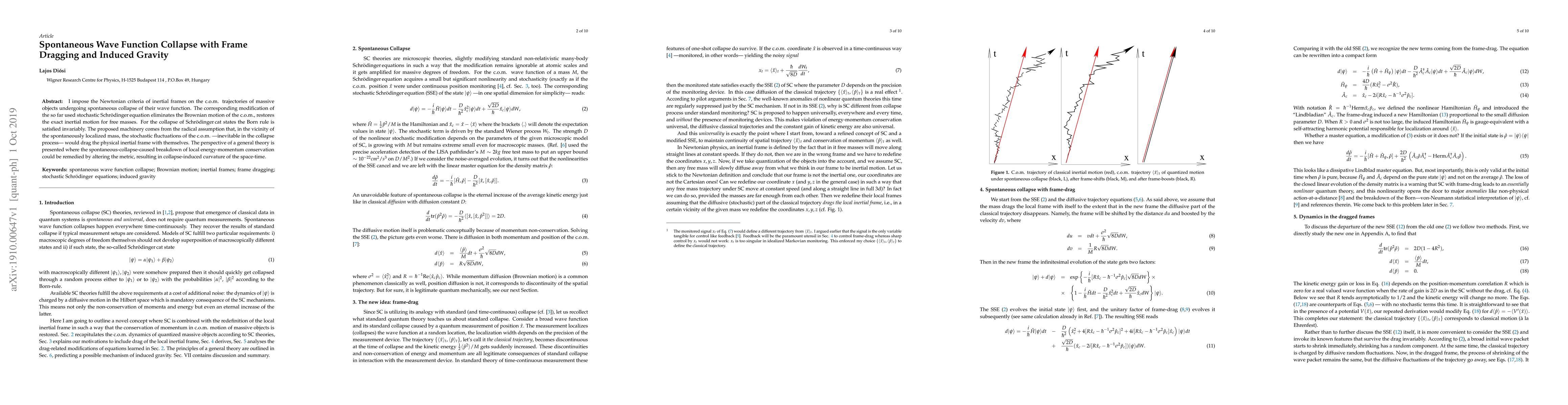 This paper proposes a modification to the stochastic Schrödinger equation to eliminate Brownian motion in the center of mass trajectories of collapsing wave functions, restoring inertial motion. It introduces frame dragging and induced gravity near collapsing masses to address the breakdown of local energy-momentum conservation, suggesting a potential general theory for spontaneous wave function collapse.