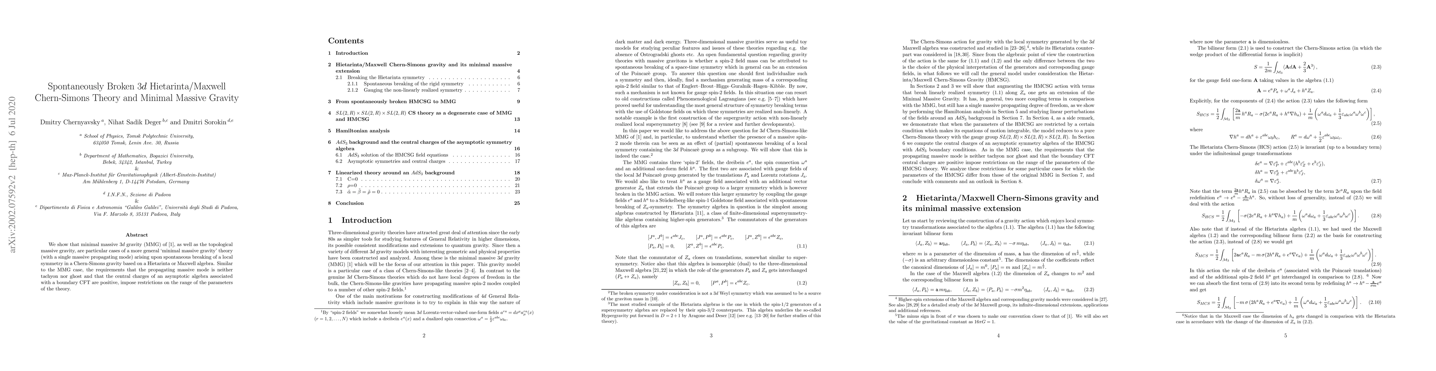 This paper demonstrates that minimal massive 3d gravity and topological massive gravity emerge from a broader 'minimal massive gravity' theory, resulting from the spontaneous breaking of a local symmetry in Chern-Simons gravity based on Hietarinta or Maxwell algebra, with constraints on parameters ensuring no tachyons or ghosts.