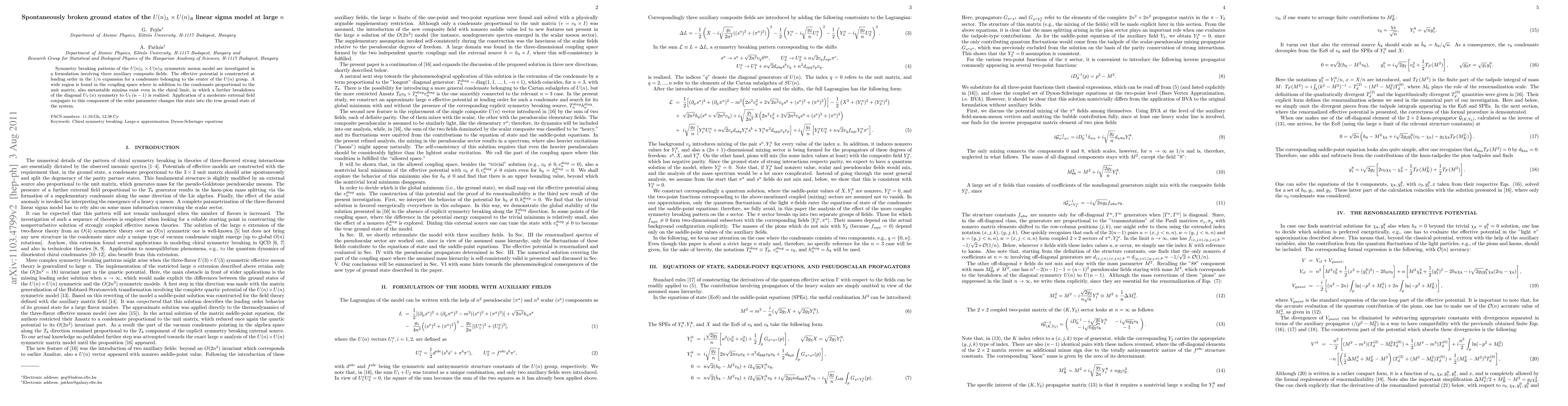 Researchers investigated symmetry breaking patterns in a U(n)_L x U(n)_R linear sigma model at large n, finding metastable minima that could lead to new insights into the behavior of complex systems.
