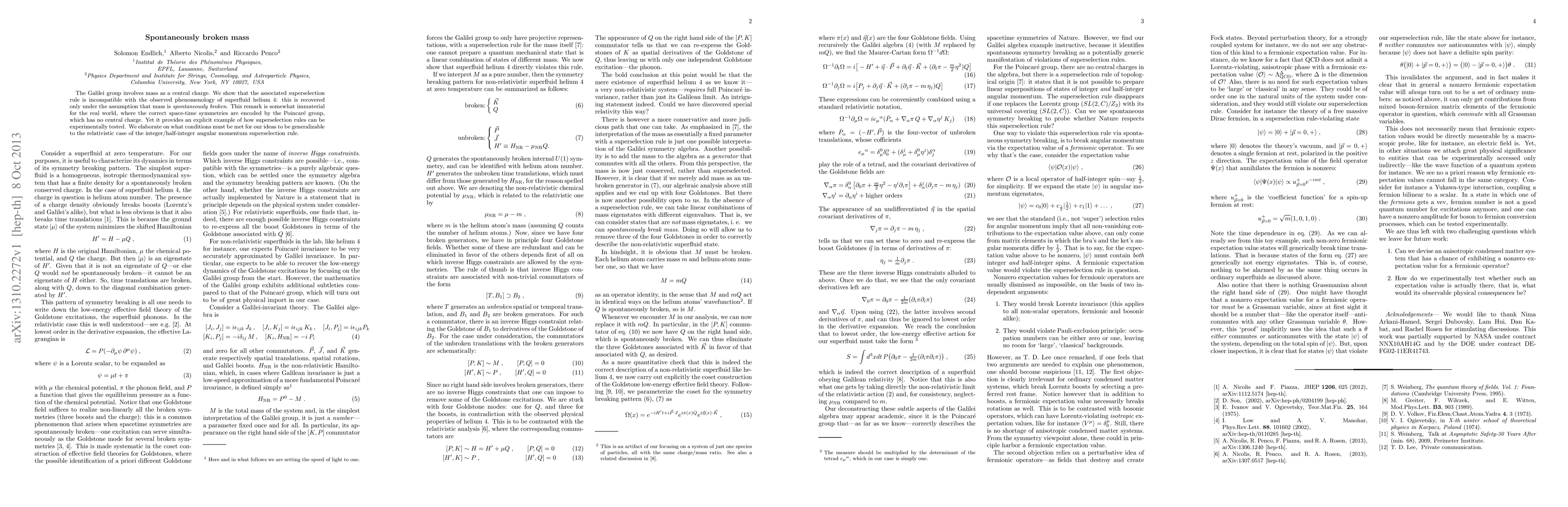 This paper demonstrates that the Galilei group's superselection rule, which is incompatible with the observed behavior of superfluid helium 4, can be reconciled by assuming spontaneous mass breaking. It also explores the conditions under which these ideas could extend to the relativistic framework.