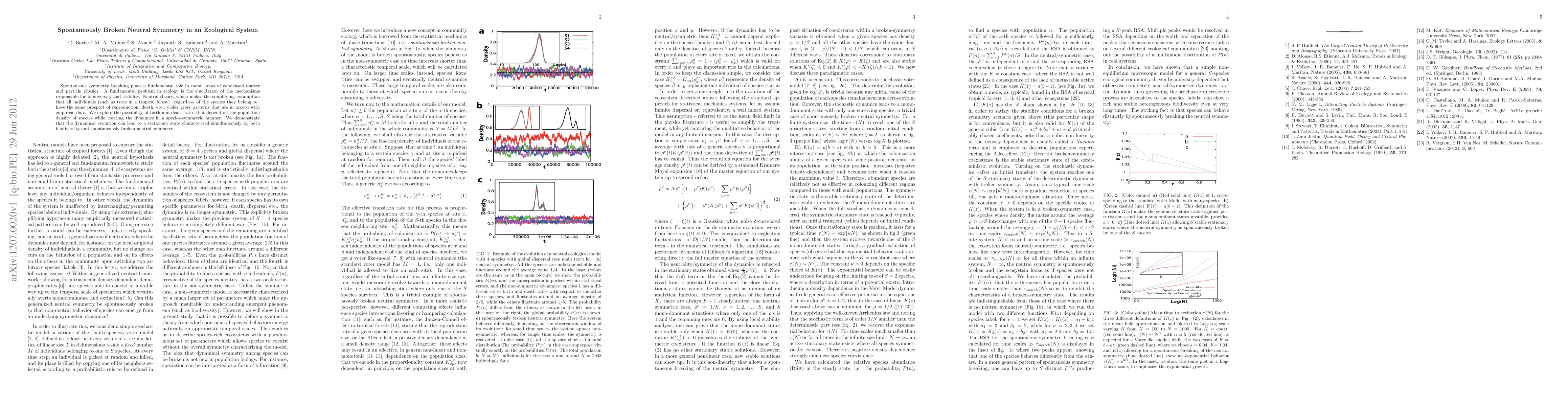 This paper investigates how spontaneous symmetry breaking in neutral ecological theory can explain biodiversity and stability in ecological systems. It shows that species-symmetric dynamics with density-dependent birth and death rates can lead to a stationary state with both biodiversity and broken neutral symmetry.