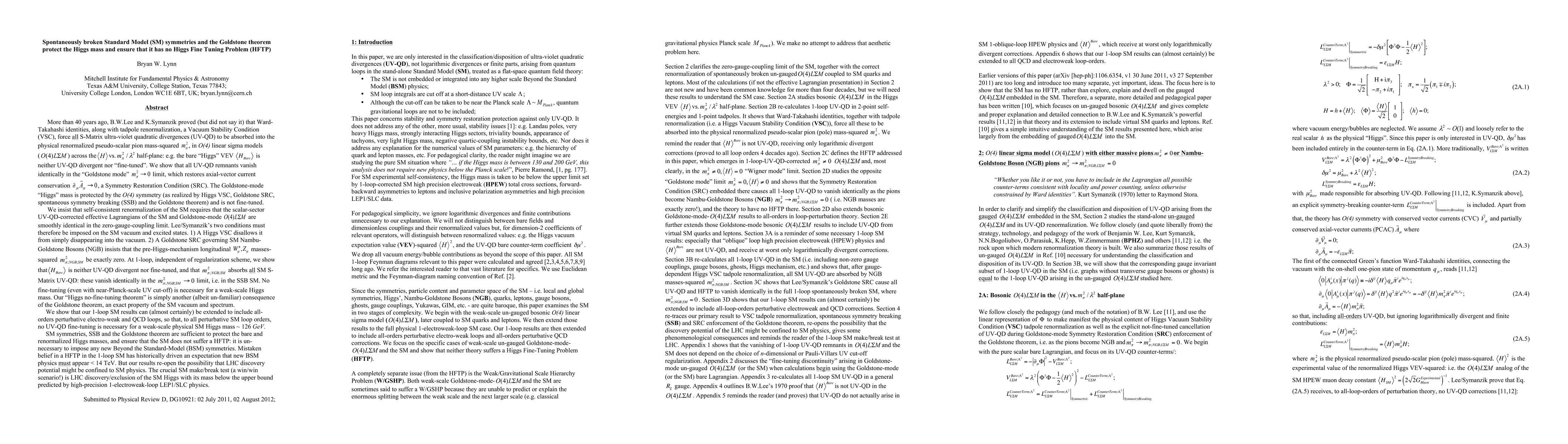 B.W.Lee/K.Symanzik proved that Ward-Takahashi identities and tadpole renormalization force all ultra-violet quadratic divergences (UV-QD) to be absorbed into the physical renormalized pseudo-scalar pion mass in O(4)LSM (linear sigma models) across the Higgs-VEV vs. Pion-Mass-Squared half-plane. We show that all UV-QD vanish identically in the "Goldstone mode" Zero-Pion-Mass spontaneous symmetry breaking (SSB) limit. The Higgs mass is protected to all loop-orders and Goldstone-mode O(4)LSM has no Higgs fine-tuning problem (HFTP). We insist that self-consistent renormalization of the Standard Model (SM) requires that the scalar-sector UV-QD-corrected effective Lagrangians of the SM and Goldstone-mode O(4)LSM are smoothly identical in the zero-gauge-coupling limit. Lee/Symanzik's two conditions must be imposed on the SM: the Higgs cannot simply disappear into the vacuum; SM Nambu-Goldstone boson (NGB) masses (i.e. the pre-Higgs-mechanism longitudinal Wand Z masses) must vanish identically. At 1-loop, the Higgs-VEV is neither UV-QD divergent nor fine-tuned. Loop-induced-artefact NGB masses absorb all SM UV-QD, which vanish identically in the Zero-NGB-Mass limit, i.e. the SSB SM. Simply another (un-familiar) consequence of the Goldstone theorem, no fine-tuning is necessary for a weak-scale Higgs mass. Our SM results can (almost certainly) be extended to include all-orders perturbative electro-weak and QCD loops. SM symmetries (as realized by SSB and the Goldstone theorem) are sufficient to protect the Higgs mass, and ensure that the SM does not suffer a HFTP. It is un-necessary to impose any new Beyond the Standard-Model (BSM) symmetries. Mistaken belief in a 1-loop SM HFTP has historically driven an expectation that new BSM physics must appear < 14 TeV. But our results re-open the possibility that LHC discovery potential might be confined to SM physics.