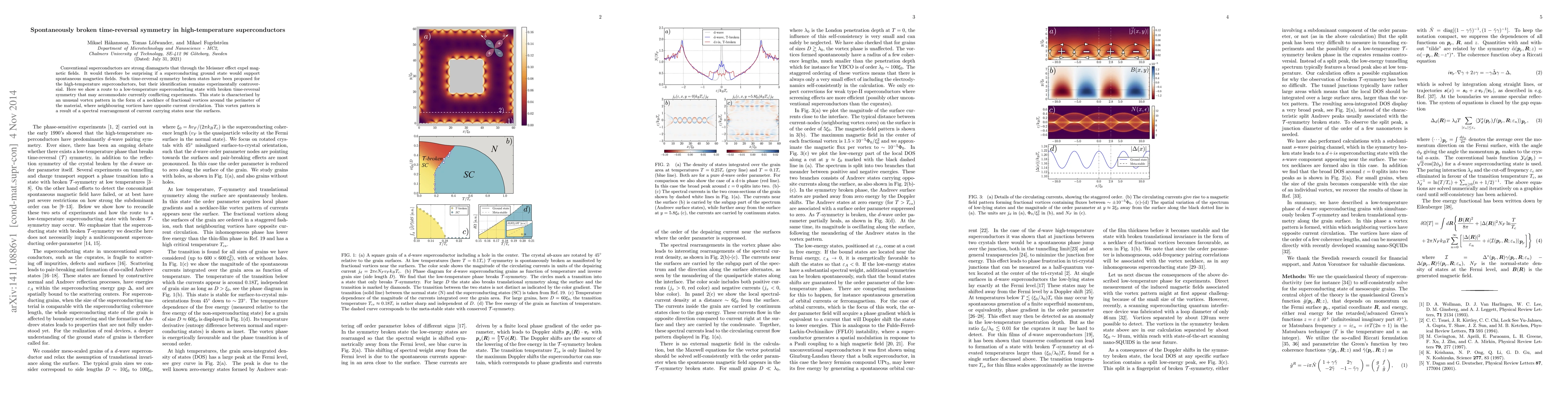 The paper presents a theoretical model for a superconducting state in high-temperature superconductors with spontaneously broken time-reversal symmetry, characterized by a unique vortex pattern of fractional vortices forming a necklace around the material's perimeter, potentially resolving experimental discrepancies. This pattern arises from a spectral rearrangement of current-carrying states near the material's surfaces.