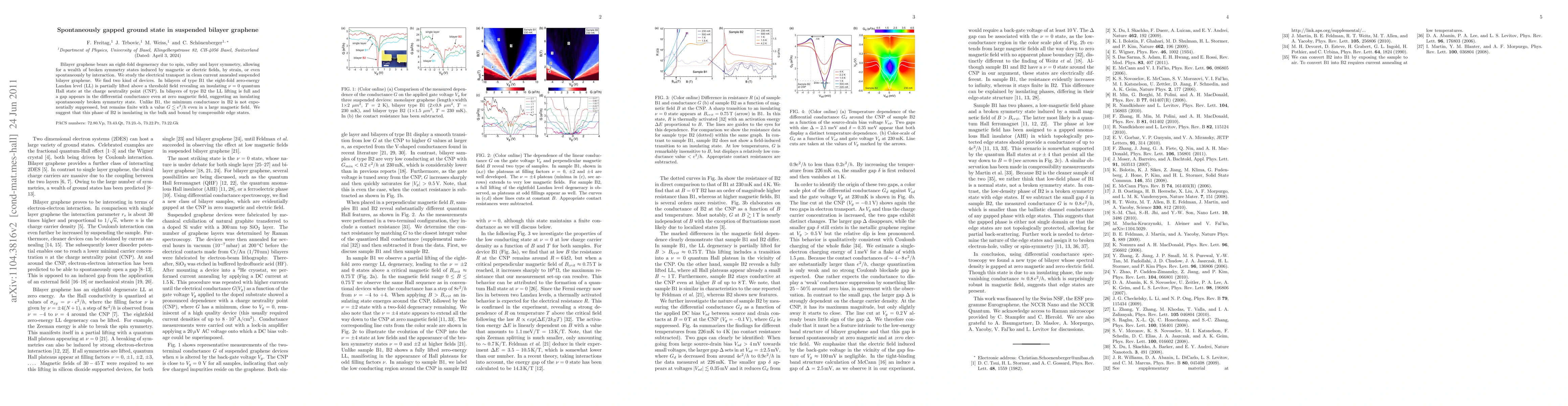 This study reveals that suspended bilayer graphene can exhibit a spontaneously gapped insulating state without external magnetic fields, characterized by a finite minimum conductance, suggesting bulk insulating behavior with compressible edge states. In contrast, bilayers of type B1 show a partial lifting of the zero-energy Landau level, leading to an insulating quantum Hall state at the charge neutrality point.