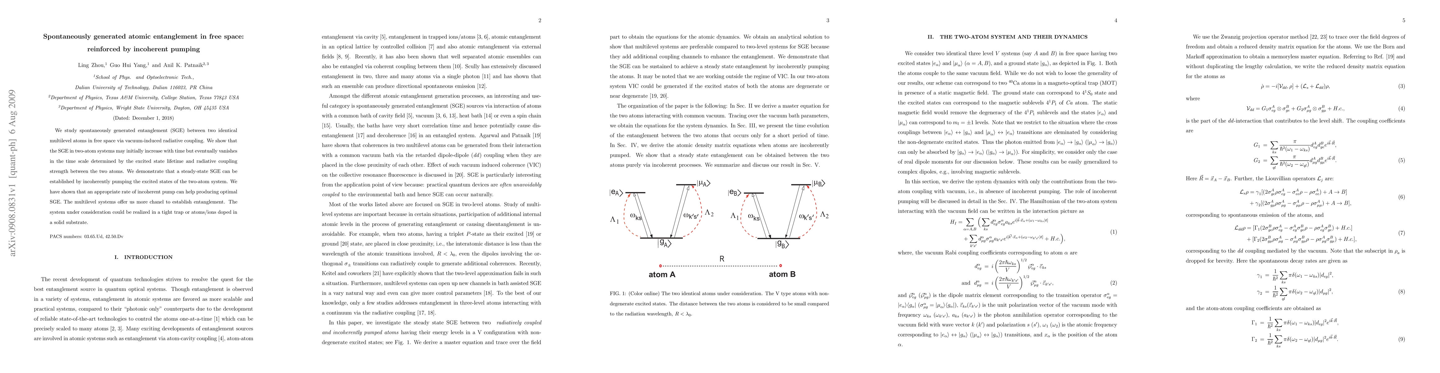 This paper investigates the spontaneous generation of entanglement (SGE) between two identical multilevel atoms in free space, showing that while SGE initially increases, it eventually diminishes due to atomic decay and coupling strength. The authors demonstrate that incoherent pumping of the atoms' excited states can establish a steady-state SGE, optimizing entanglement through an appropriate pumping rate.
