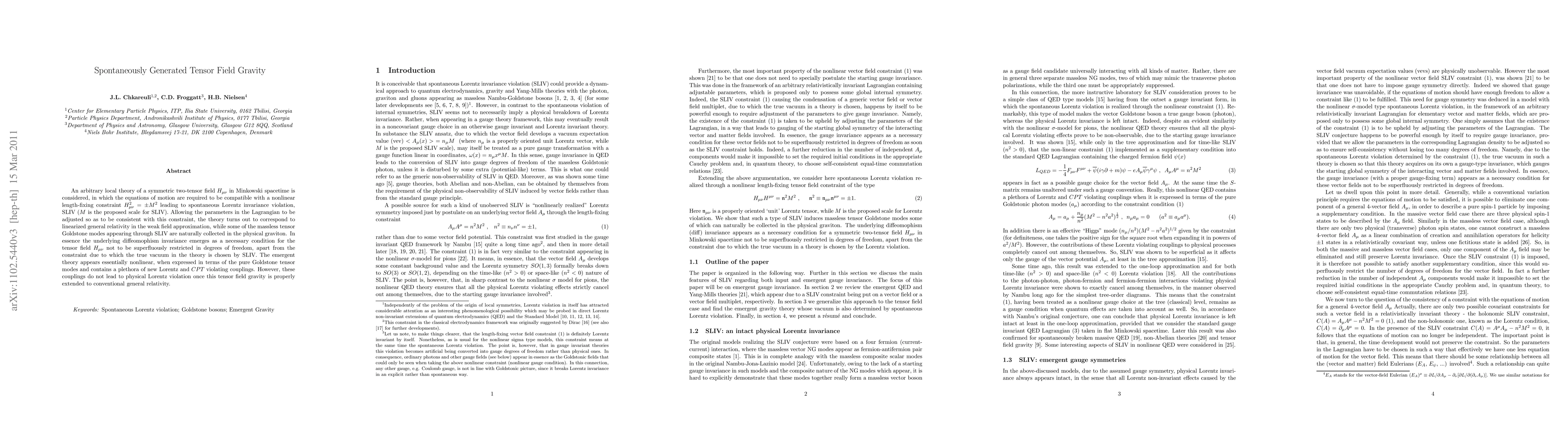 An arbitrary local theory of a symmetric two-tensor field $H_{\mu \nu}$ in Minkowski spacetime is considered, in which the equations of motion are required to be compatible with a nonlinear length-fixing constraint $H_{\mu \nu}^{2}=\pm M^{2}$ leading to spontaneous Lorentz invariance violation, SLIV ($M$ is the proposed scale for SLIV). Allowing the parameters in the Lagrangian to be adjusted so as to be consistent with this constraint, the theory turns out to correspond to linearized general relativity in the weak field approximation, while some of the massless tensor Goldstone modes appearing through SLIV are naturally collected in the physical graviton. In essence the underlying diffeomophism invariance emerges as a necessary condition for the tensor field $H_{\mu \nu}$ not to be superfluously restricted in degrees of freedom, apart from the constraint due to which the true vacuum in the theory is chosen by SLIV. The emergent theory appears essentially nonlinear, when expressed in terms of the pure Goldstone tensor modes and contains a plethora of new Lorentz and $CPT$ violating couplings. However, these couplings do not lead to physical Lorentz violation once this tensor field gravity is properly extended to conventional general relativity.