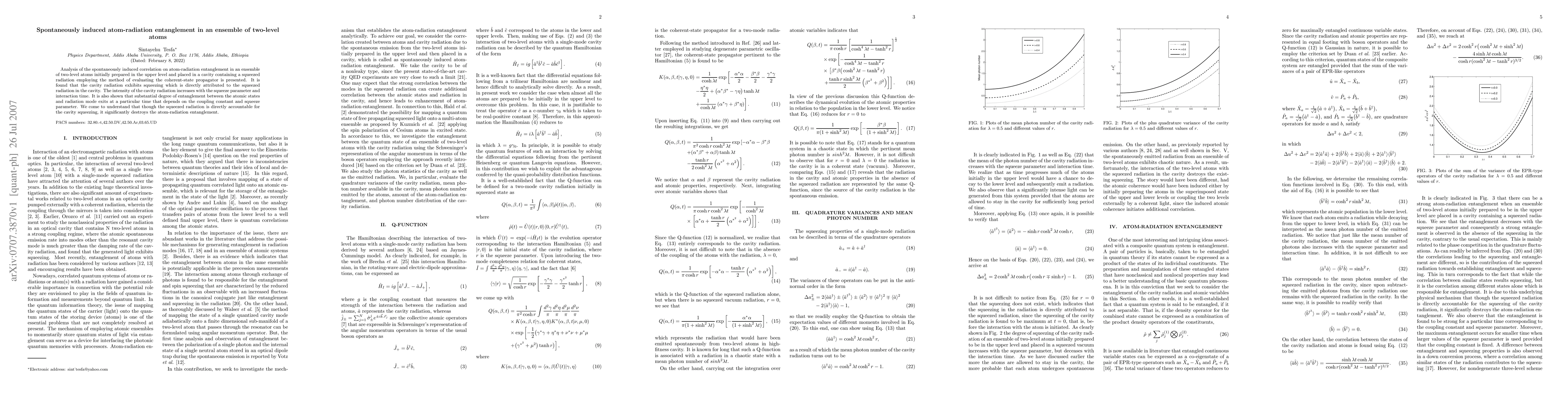 Analysis of the spontaneously induced correlation on atom-radiation entanglement in an ensemble of two-level atoms initially prepared in the upper level and placed in a cavity containing a squeezed radiation employing the method of evaluating the coherent-state propagator is presented. It is found that the cavity radiation exhibits squeezing which is directly attributed to the squeezed radiation in the cavity. The intensity of the cavity radiation increases with the squeeze parameter and interaction time. It is also shown that substantial degree of entanglement between the atomic states and radiation mode exits at a particular time that depends on the coupling constant and squeeze parameter. We come to understand that though the squeezed radiation is directly accountable for the cavity squeezing, it significantly destroys the atom-radiation entanglement.