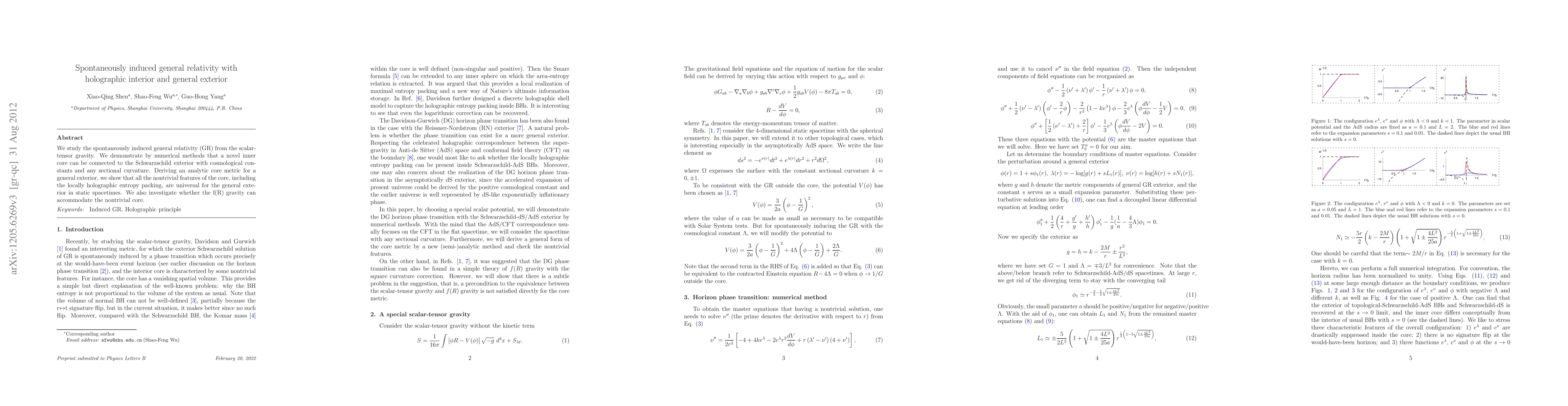We study the spontaneously induced general relativity (GR) from the scalar-tensor gravity. We demonstrate by numerical methods that a novel inner core can be connected to the Schwarzschild exterior with cosmological constants and any sectional curvature. Deriving an analytic core metric for a general exterior, we show that all the nontrivial features of the core, including the locally holographic entropy packing, are universal for the general exterior in static spacetimes. We also investigate whether the f(R) gravity can accommodate the nontrivial core.