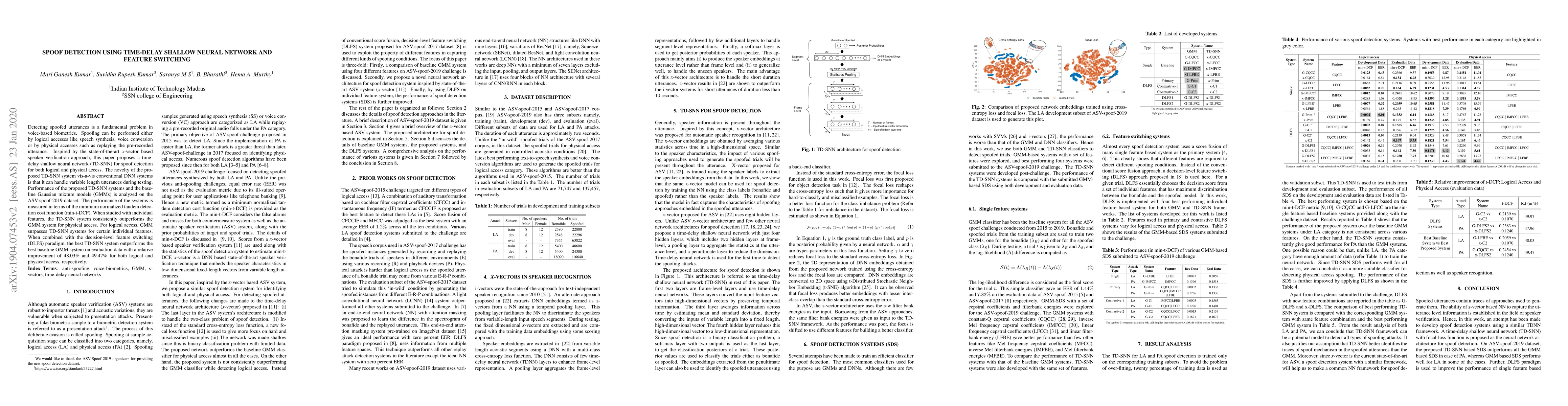Detecting spoofed utterances is a fundamental problem in voice-based biometrics. Spoofing can be performed either by logical accesses like speech synthesis, voice conversion or by physical accesses such as replaying the pre-recorded utterance. Inspired by the state-of-the-art \emph{x}-vector based speaker verification approach, this paper proposes a time-delay shallow neural network (TD-SNN) for spoof detection for both logical and physical access. The novelty of the proposed TD-SNN system vis-a-vis conventional DNN systems is that it can handle variable length utterances during testing. Performance of the proposed TD-SNN systems and the baseline Gaussian mixture models (GMMs) is analyzed on the ASV-spoof-2019 dataset. The performance of the systems is measured in terms of the minimum normalized tandem detection cost function (min-t-DCF). When studied with individual features, the TD-SNN system consistently outperforms the GMM system for physical access. For logical access, GMM surpasses TD-SNN systems for certain individual features. When combined with the decision-level feature switching (DLFS) paradigm, the best TD-SNN system outperforms the best baseline GMM system on evaluation data with a relative improvement of 48.03\% and 49.47\% for both logical and physical access, respectively.