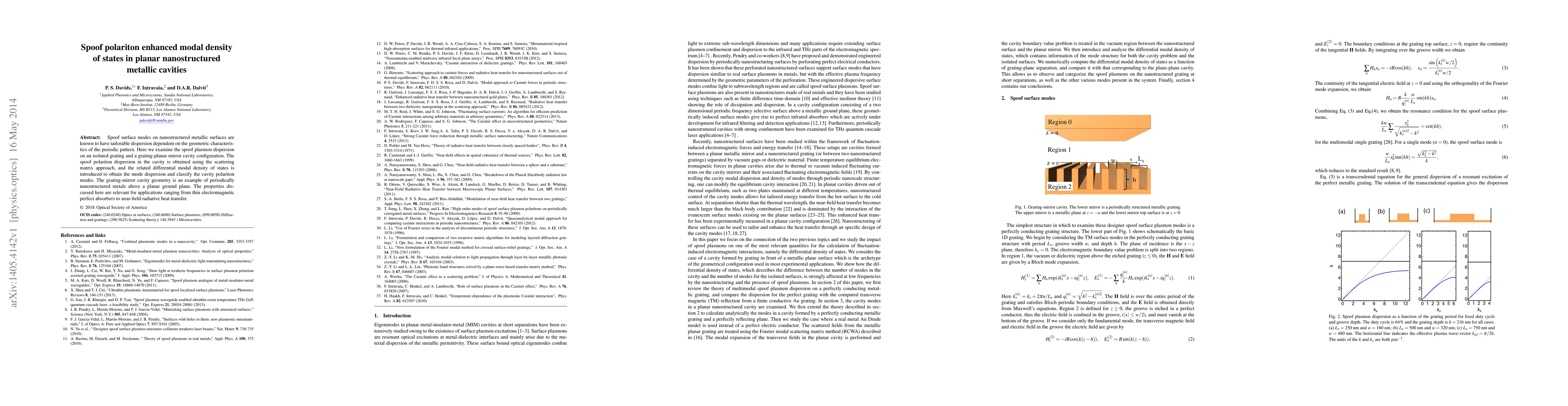 This paper investigates the dispersion of spoof polaritons in planar nanostructured metallic cavities, specifically focusing on grating-planar mirror configurations. The study employs the scattering matrix approach to determine the modal density of states, revealing significant implications for applications in electromagnetic absorbers and radiative heat transfer.