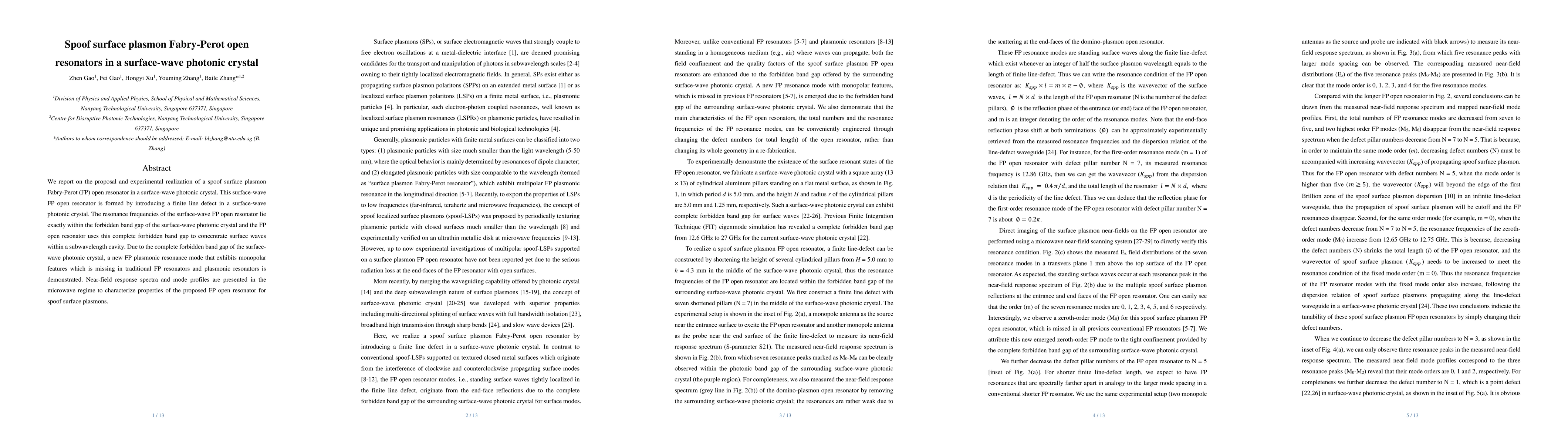 This paper proposes and experimentally demonstrates a spoof surface plasmon Fabry-Perot open resonator in a surface-wave photonic crystal, utilizing a finite line defect to create a subwavelength cavity within the forbidden band gap. The resonator exhibits unique monopolar features and concentrates surface waves effectively, characterized by near-field response spectra in the microwave regime.