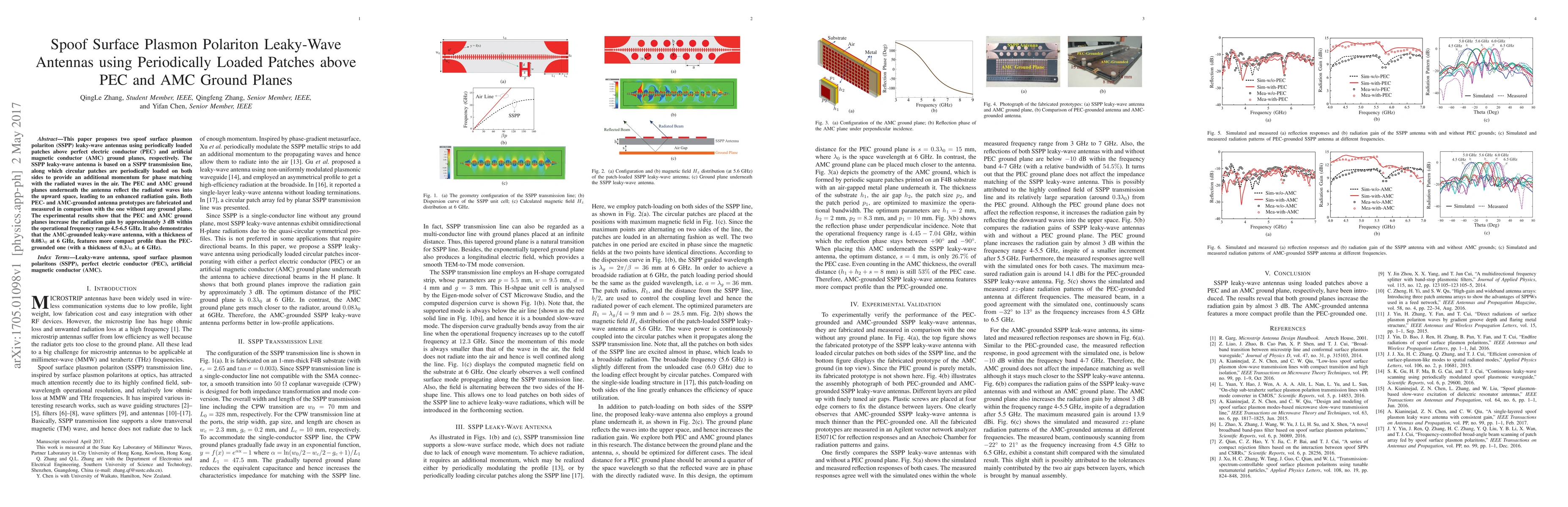 This paper proposes two spoof surface plasmon polariton leaky-wave antennas using periodically loaded patches above PEC and AMC ground planes, showing enhanced radiation gain and a more compact profile for the AMC-grounded antenna. Experimental results confirm a 3 dB gain increase and a thinner profile for the AMC-grounded design.