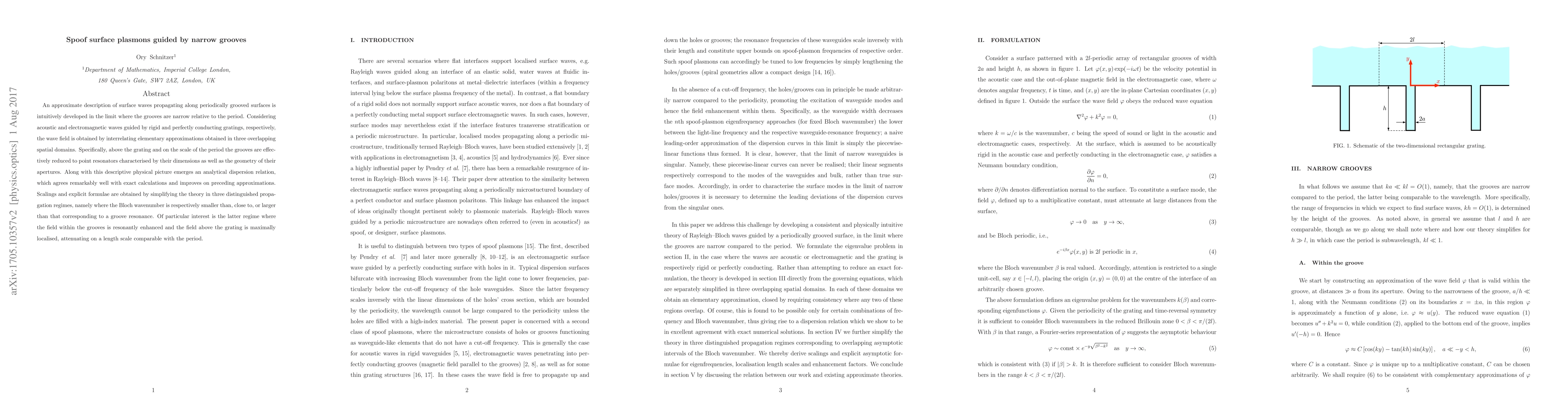 An approximate description of surface waves propagating along periodically grooved surfaces is intuitively developed in the limit where the grooves are narrow relative to the period. Considering acoustic and electromagnetic waves guided by rigid and perfectly conducting gratings, respectively, the wave field is obtained by interrelating elementary approximations obtained in three overlapping spatial domains. Specifically, above the grating and on the scale of the period the grooves are effectively reduced to point resonators characterised by their dimensions as well as the geometry of their apertures. Along with this descriptive physical picture emerges an analytical dispersion relation, which agrees remarkably well with exact calculations and improves on preceding approximations. Scalings and explicit formulae are obtained by simplifying the theory in three distinguished propagation regimes, namely where the Bloch wavenumber is respectively smaller than, close to, or larger than that corresponding to a groove resonance. Of particular interest is the latter regime where the field within the grooves is resonantly enhanced and the field above the grating is maximally localised, attenuating on a length scale comparable with the period.