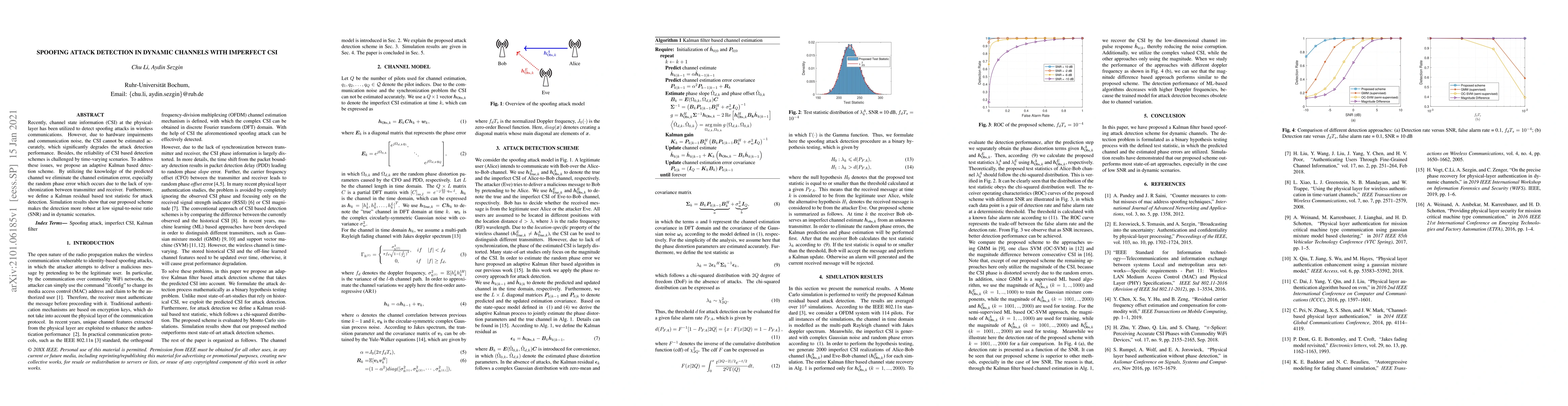 Recently, channel state information (CSI) at the physical-layer has been utilized to detect spoofing attacks in wireless communications. However, due to hardware impairments and communication noise, the CSI cannot be estimated accurately, which significantly degrades the attack detection performance. Besides, the reliability of CSI based detection schemes is challenged by time-varying scenarios. To address these issues, we propose an adaptive Kalman based detection scheme. By utilizing the knowledge of the predicted channel we eliminate the channel estimation error, especially the random phase error which occurs due to the lack of synchronization between transmitter and receiver. Furthermore, we define a Kalman residual based test statistic for attack detection. Simulation results show that our proposed scheme makes the detection more robust at low signal-to-noise ratio (SNR) and in dynamic scenarios.