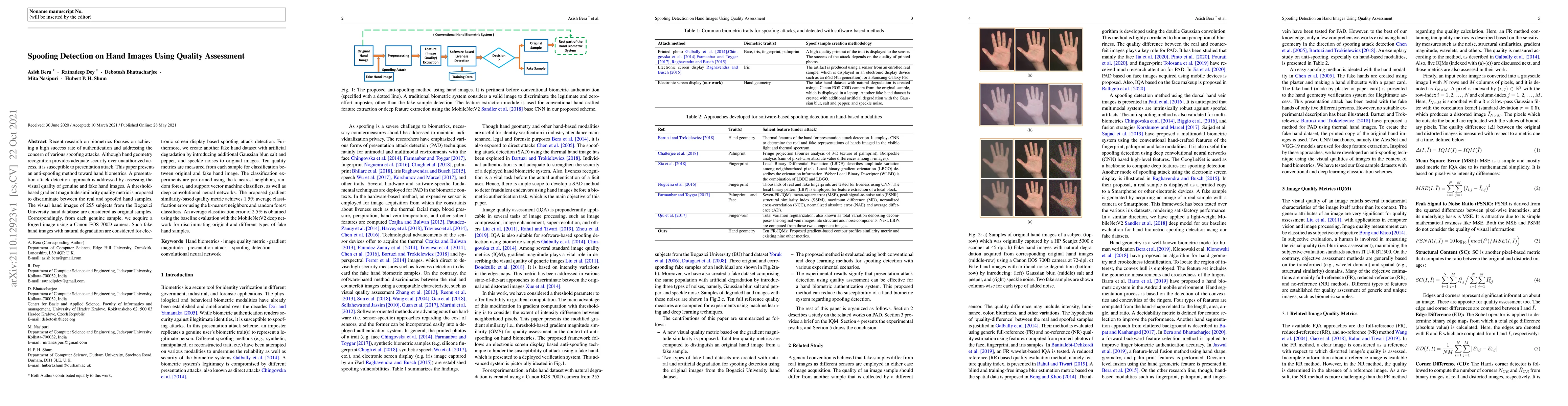 Recent research on biometrics focuses on achieving a high success rate of authentication and addressing the concern of various spoofing attacks. Although hand geometry recognition provides adequate security over unauthorized access, it is susceptible to presentation attack. This paper presents an anti-spoofing method toward hand biometrics. A presentation attack detection approach is addressed by assessing the visual quality of genuine and fake hand images. A threshold-based gradient magnitude similarity quality metric is proposed to discriminate between the real and spoofed hand samples. The visual hand images of 255 subjects from the Bogazici University hand database are considered as original samples. Correspondingly, from each genuine sample, we acquire a forged image using a Canon EOS 700D camera. Such fake hand images with natural degradation are considered for electronic screen display based spoofing attack detection. Furthermore, we create another fake hand dataset with artificial degradation by introducing additional Gaussian blur, salt and pepper, and speckle noises to original images. Ten quality metrics are measured from each sample for classification between original and fake hand image. The classification experiments are performed using the k-nearest neighbors, random forest, and support vector machine classifiers, as well as deep convolutional neural networks. The proposed gradient similarity-based quality metric achieves 1.5% average classification er ror using the k-nearest neighbors and random forest classifiers. An average classification error of 2.5% is obtained using the baseline evaluation with the MobileNetV2 deep network for discriminating original and different types of fake hand samples.