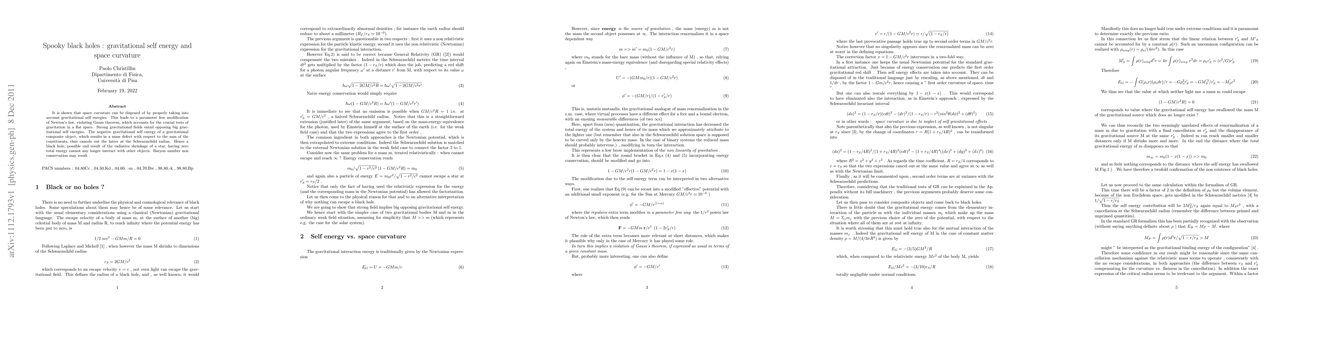 It is shown that space curvature can be disposed of by properly taking into account gravitational self energies. This leads to a parameter free modification of Newton's law, violating Gauss theorem, which accounts for the crucial tests of gravitation in a flat space. Strong gravitational fields entail opposing big gravitational self energies. The negative gravitational self energy of a gravitational composite object, which results in a mass defect with respect to the sum of the constituents, thus cancels out the latter at the Schwarzschild radius. Hence a black hole, possible end result of the radiative shrinkage of a star, having zero total energy cannot any longer interact with other objects. Baryon number non conservation may result .