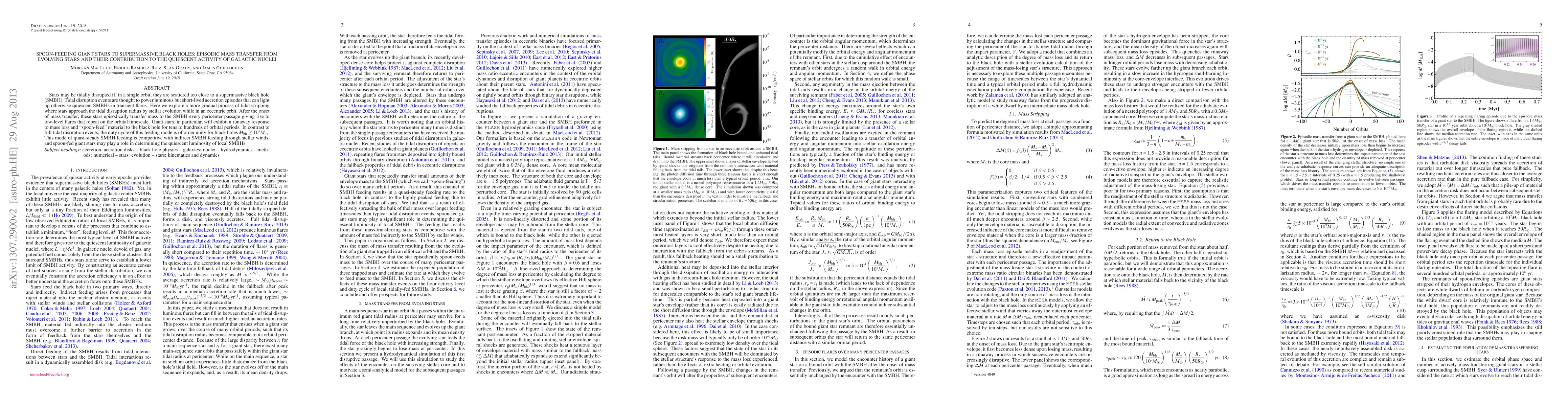 This paper investigates the gradual tidal stripping of stars as they evolve and approach supermassive black holes (SMBHs), leading to episodic mass transfer and low-level flares. Unlike full tidal disruption events, this "spoon-feeding" process is sustained for tens to hundreds of orbital periods, significantly impacting the quiescent activity of SMBHs.