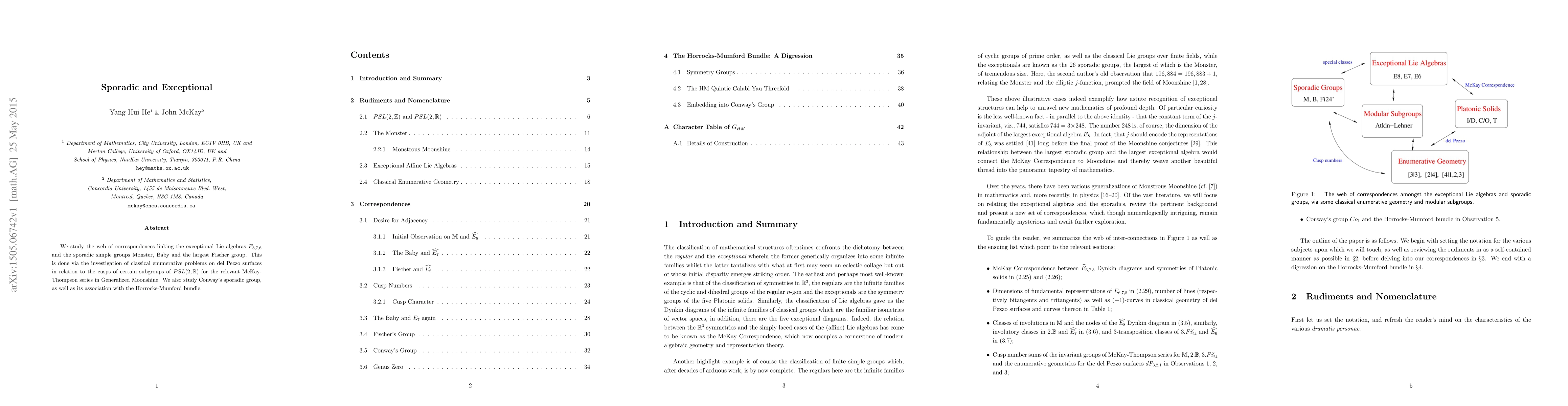 This paper explores connections between exceptional Lie algebras $E_{8,7,6}$ and sporadic simple groups, including the Monster, Baby, and Fischer groups, through classical enumerative problems on del Pezzo surfaces and the cusps of certain $PSL(2,R)$ subgroups, linking to Generalized Moonshine and Conway's sporadic group via the Horrocks-Mumford bundle.