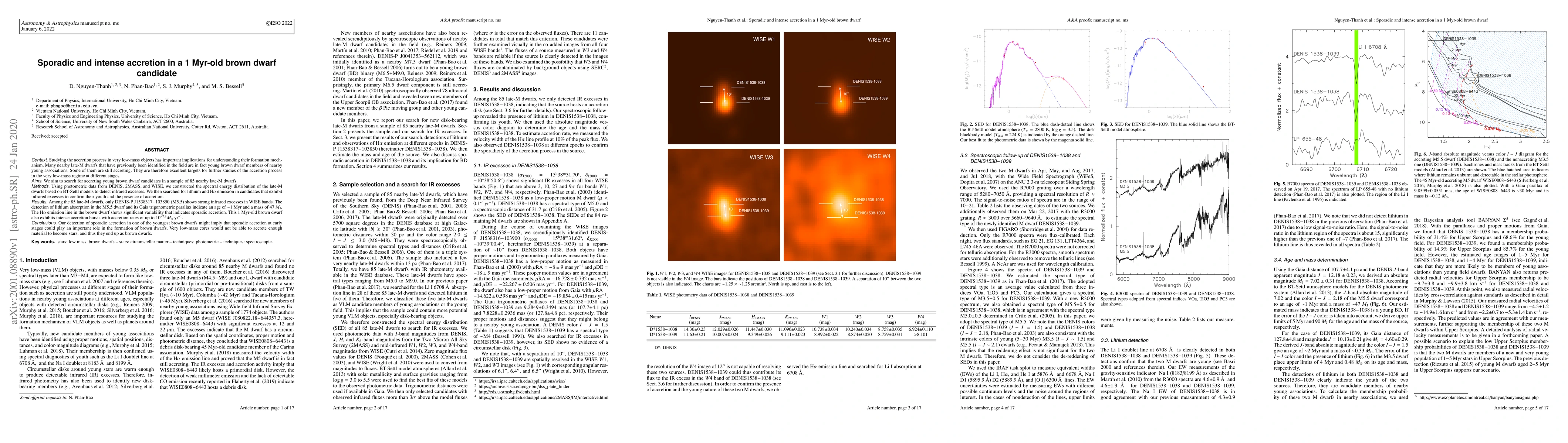 Studying the accretion process in very low-mass objects has important implications for understanding their formation mechanism. Many nearby late-M dwarfs that have previously been identified in the field are in fact young brown dwarf members of nearby young associations. Some of them are still accreting. They are therefore excellent targets for further studies of the accretion process in the very low-mass regime at different stages. We aim to search for accreting young brown dwarf candidates in a sample of 85 nearby late-M dwarfs. Using photometric data from DENIS, 2MASS, and WISE, we constructed the spectral energy distribution of the late-M dwarfs based on BT-Settl models to detect infrared excesses. We then searched for lithium and H$\alpha$ emission in candidates that exhibit infrared excesses to confirm their youth and the presence of accretion. Among the 85 late-M dwarfs, only DENIS-P J1538317$-$103850 (M5.5) shows strong infrared excesses in WISE bands. The detection of lithium absorption in the M5.5 dwarf and its Gaia trigonometric parallax indicate an age of $\sim$1 Myr and a mass of 47 $M_{\rm J}$. The H$\alpha$ emission line in the brown dwarf shows significant variability that indicates sporadic accretion. This 1 Myr-old brown dwarf also exhibits intense accretion bursts with accretion rates of up to $10^{-7.9}$$M_{\odot}$ yr$^{-1}$. Our detection of sporadic accretion in one of the youngest brown dwarfs might imply that sporadic accretion at early stages could play an important role in the formation of brown dwarfs. Very low-mass cores would not be able to accrete enough material to become stars, and thus they end up as brown dwarfs.