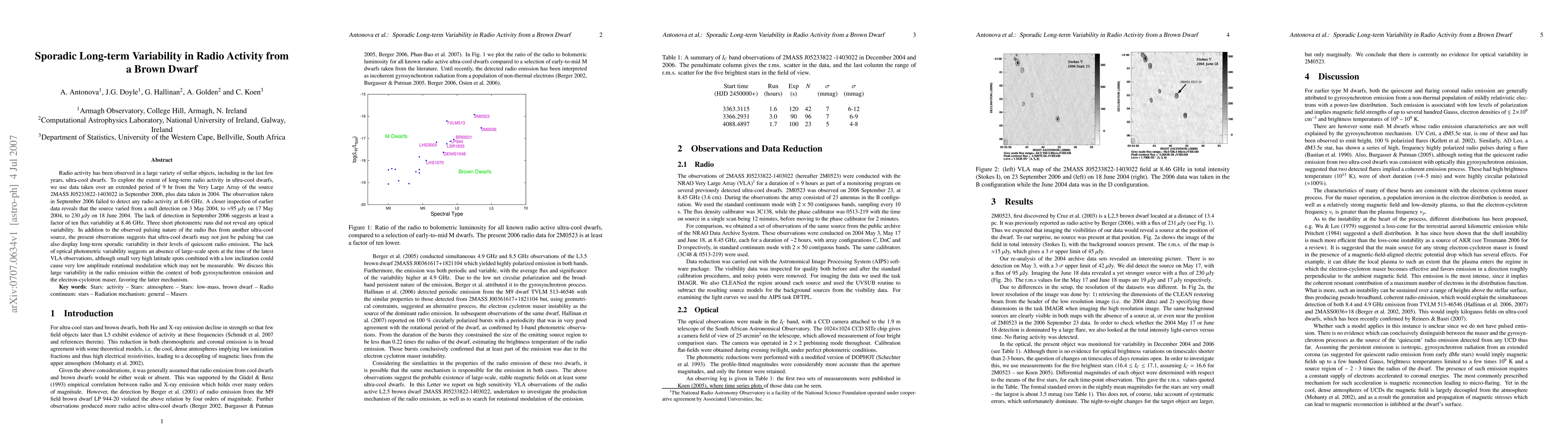 Radio activity has been observed in a large variety of stellar objects, including in the last few years, ultra-cool dwarfs. To explore the extent of long-term radio activity in ultra-cool dwarfs, we use data taken over an extended period of 9 hr from the Very Large Array of the source 2MASS J05233822-1403022 in September 2006, plus data taken in 2004. The observation taken in September 2006 failed to detect any radio activity at 8.46 GHz. A closer inspection of earlier data reveals that the source varied from a null detection on 3 May 2004, to $\approx$95 $\mu$Jy on 17 May 2004, to 230 $\mu$Jy on 18 June 2004. The lack of detection in September 2006 suggests at least a factor of ten flux variability at 8.46 GHz. Three short photometric runs did not reveal any optical variability. In addition to the observed pulsing nature of the radio flux from another ultra-cool source, the present observations suggests that ultra-cool dwarfs may not just be pulsing but can also display long-term sporadic variability in their levels of quiescent radio emission. The lack of optical photometric variability suggests an absence of large-scale spots at the time of the latest VLA observations, although small very high latitude spots combined with a low inclination could cause very low amplitude rotational modulation which may not be measurable. We discuss this large variability in the radio emission within the context of both gyrosynchrotron emission and the electron-cyclotron maser, favoring the latter mechanism.
