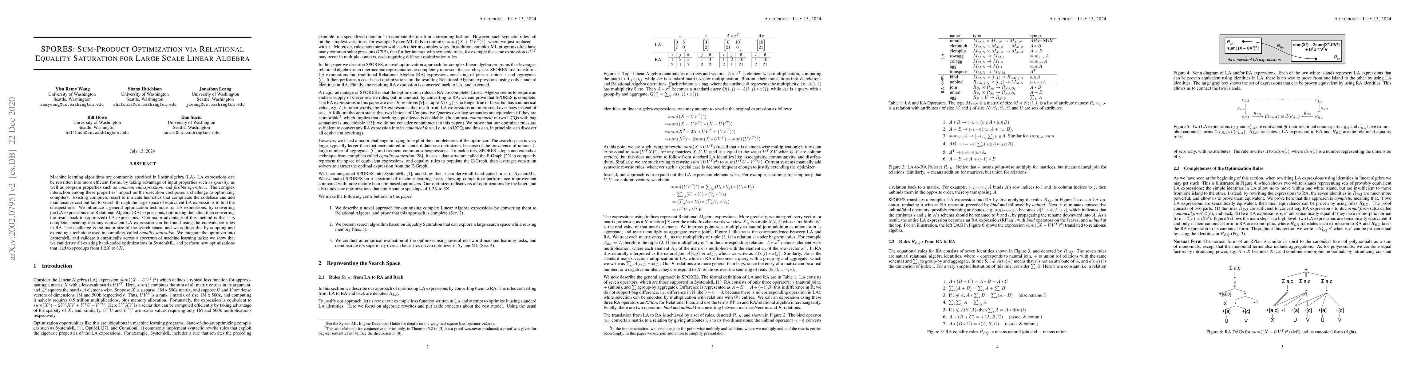 Machine learning algorithms are commonly specified in linear algebra (LA). LA expressions can be rewritten into more efficient forms, by taking advantage of input properties such as sparsity, as well as program properties such as common subexpressions and fusible operators. The complex interaction among these properties' impact on the execution cost poses a challenge to optimizing compilers. Existing compilers resort to intricate heuristics that complicate the codebase and add maintenance cost but fail to search through the large space of equivalent LA expressions to find the cheapest one. We introduce a general optimization technique for LA expressions, by converting the LA expressions into Relational Algebra (RA) expressions, optimizing the latter, then converting the result back to (optimized) LA expressions. One major advantage of this method is that it is complete, meaning that any equivalent LA expression can be found using the equivalence rules in RA. The challenge is the major size of the search space, and we address this by adopting and extending a technique used in compilers, called equality saturation. We integrate the optimizer into SystemML and validate it empirically across a spectrum of machine learning tasks; we show that we can derive all existing hand-coded optimizations in SystemML, and perform new optimizations that lead to speedups from 1.2X to 5X.