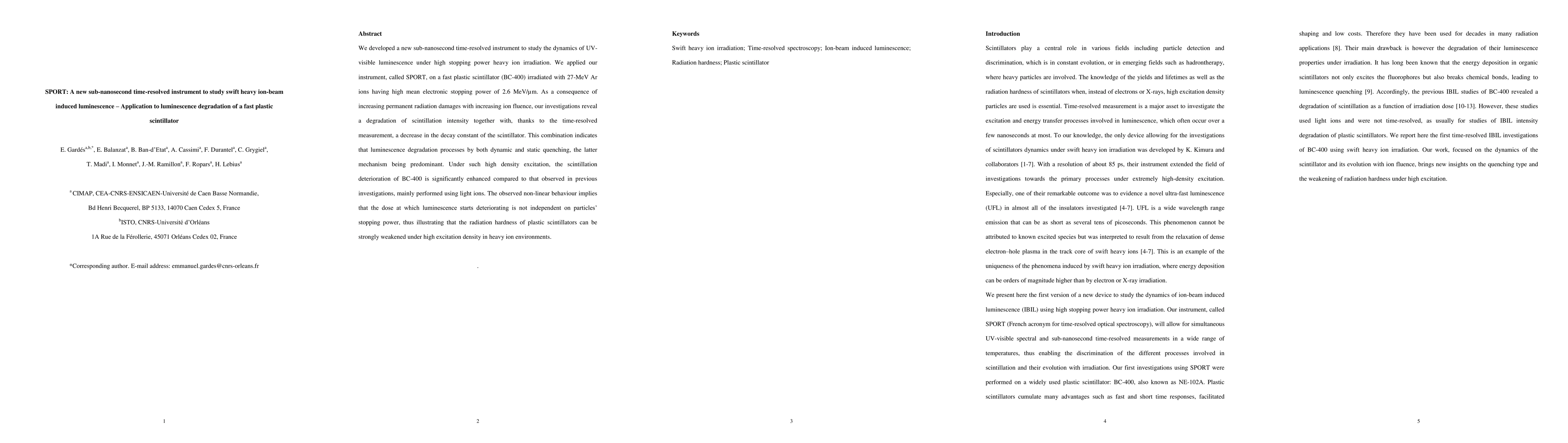 The paper introduces SPORT, a new sub-nanosecond time-resolved instrument for studying luminescence dynamics under heavy ion irradiation, and applies it to investigate the degradation of a fast plastic scintillator (BC-400) under high stopping power ion beams. The study reveals significant scintillation intensity and decay constant degradation, indicating predominant static quenching and enhanced deterioration under high excitation density.