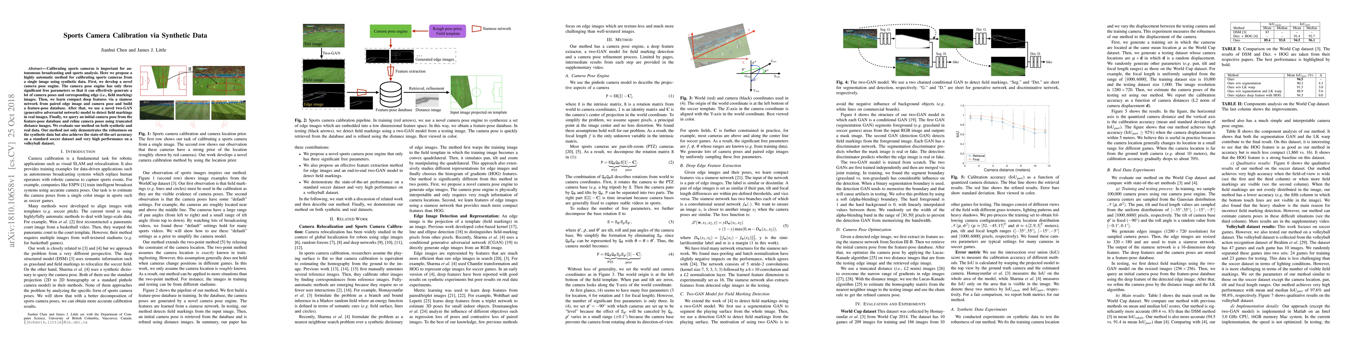 This paper proposes an automatic method for calibrating sports cameras using synthetic data, involving a camera pose engine, deep feature learning, and a two-GAN model for detecting field markings, achieving state-of-the-art accuracy on soccer and volleyball datasets.