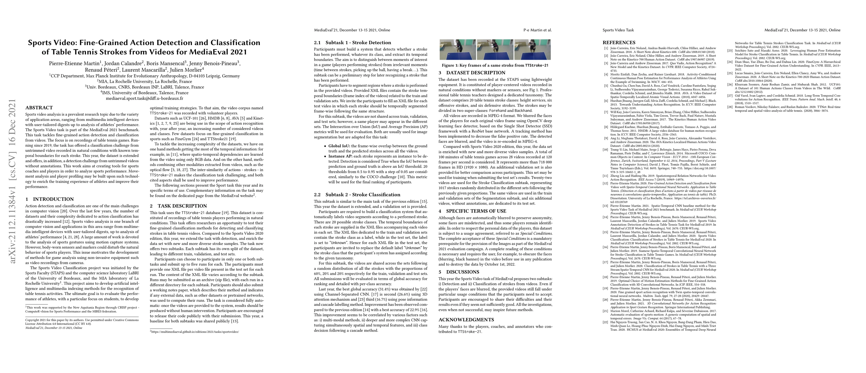 Sports video analysis is a prevalent research topic due to the variety of application areas, ranging from multimedia intelligent devices with user-tailored digests up to analysis of athletes' performance. The Sports Video task is part of the MediaEval 2021 benchmark. This task tackles fine-grained action detection and classification from videos. The focus is on recordings of table tennis games. Running since 2019, the task has offered a classification challenge from untrimmed video recorded in natural conditions with known temporal boundaries for each stroke. This year, the dataset is extended and offers, in addition, a detection challenge from untrimmed videos without annotations. This work aims at creating tools for sports coaches and players in order to analyze sports performance. Movement analysis and player profiling may be built upon such technology to enrich the training experience of athletes and improve their performance.