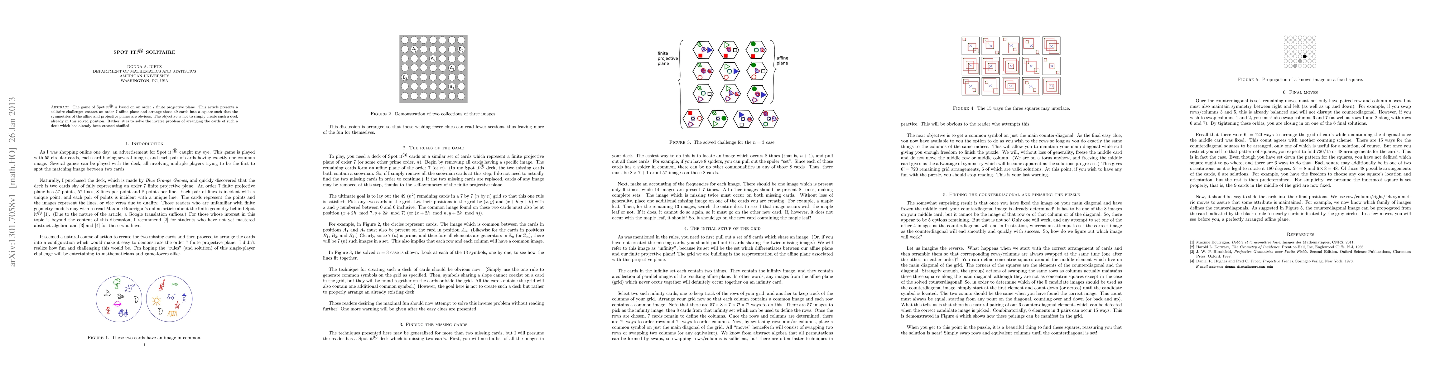 The game of Spot it(R) is based on an order 7 finite projective plane. This article presents a solitaire challenge: extract an order 7 affine plane and arrange those 49 cards into a square such that the symmetries of the affine and projective planes are obvious. The objective is not to simply create such a deck already in this solved position. Rather, it is to solve the inverse problem of arranging the cards of such a deck which has already been created shuffled.