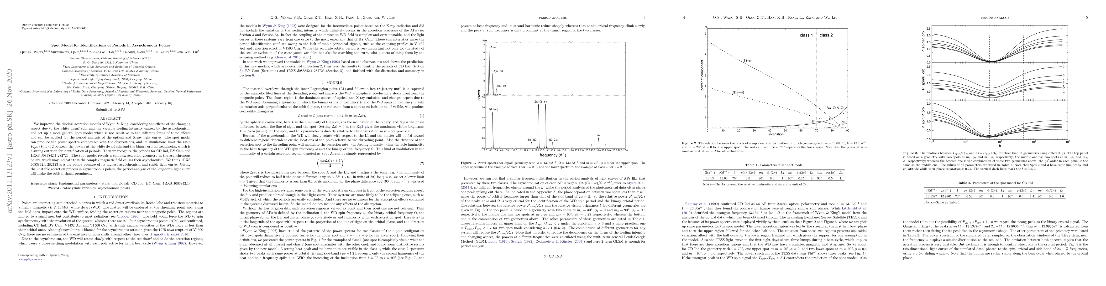This paper introduces a refined spot model for analyzing periods in asynchronous polars, accounting for spin-induced aspect changes and variable accretion intensity. The model identifies periods in specific systems and suggests complex accretion geometries, indicating magnetic field complexities and pre-polar status for 1RXS J083842.1-282723.