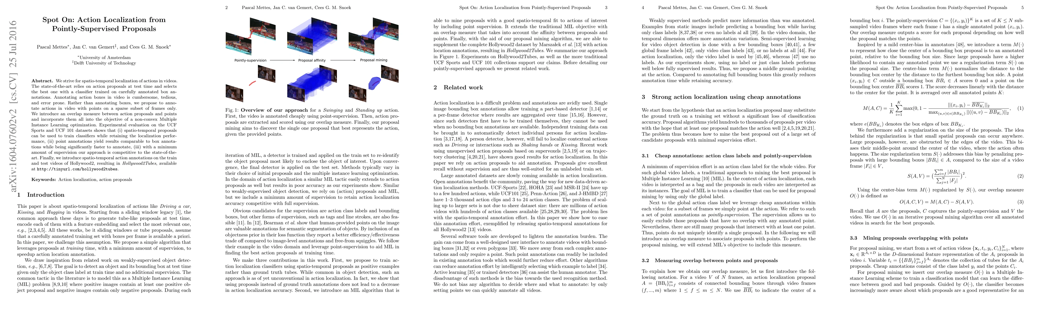 We strive for spatio-temporal localization of actions in videos. The state-of-the-art relies on action proposals at test time and selects the best one with a classifier trained on carefully annotated box annotations. Annotating action boxes in video is cumbersome, tedious, and error prone. Rather than annotating boxes, we propose to annotate actions in video with points on a sparse subset of frames only. We introduce an overlap measure between action proposals and points and incorporate them all into the objective of a non-convex Multiple Instance Learning optimization. Experimental evaluation on the UCF Sports and UCF 101 datasets shows that (i) spatio-temporal proposals can be used to train classifiers while retaining the localization performance, (ii) point annotations yield results comparable to box annotations while being significantly faster to annotate, (iii) with a minimum amount of supervision our approach is competitive to the state-of-the-art. Finally, we introduce spatio-temporal action annotations on the train and test videos of Hollywood2, resulting in Hollywood2Tubes, available at http://tinyurl.com/hollywood2tubes.