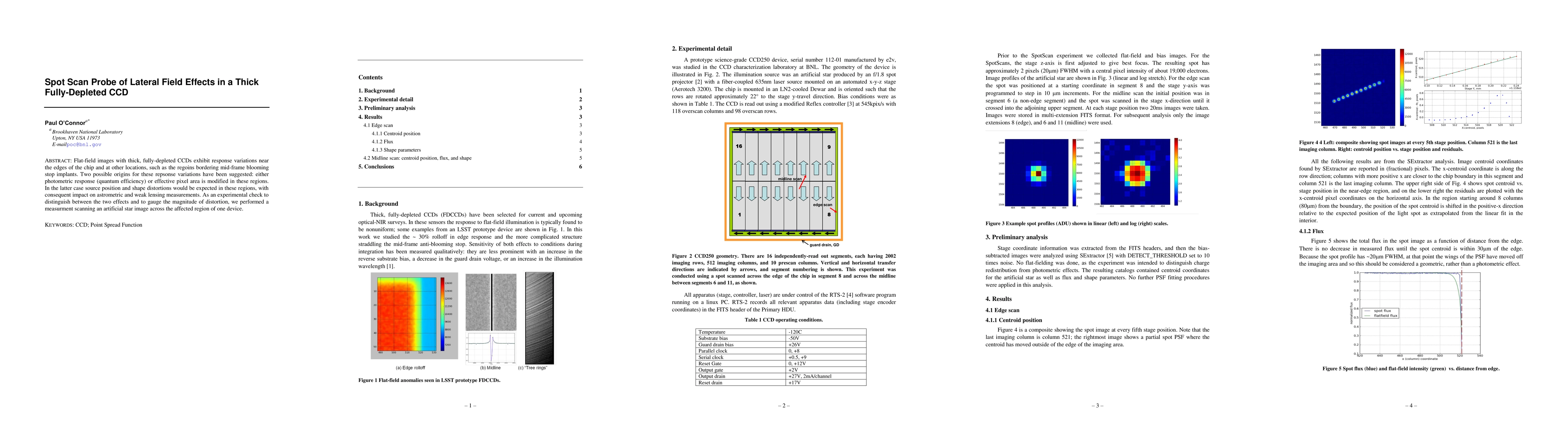 Flat-field images with thick, fully-depleted CCDs exhibit response variations near the edges of the chip and at other locations, such as the regoins bordering mid-frame blooming stop implants. Two possible origins for these repsonse variations have been suggested: either photometric response (quantum efficiency) or effective pixel area is modified in these regions. In the latter case source position and shape distortions would be expected in these regions, with consequent impact on astrometric and weak lensing measurements. As an experimental check to distinguish between the two effects and to gauge the magnitude of distortion, we performed a measurment scanning an artificial star image across the affected region of one device.