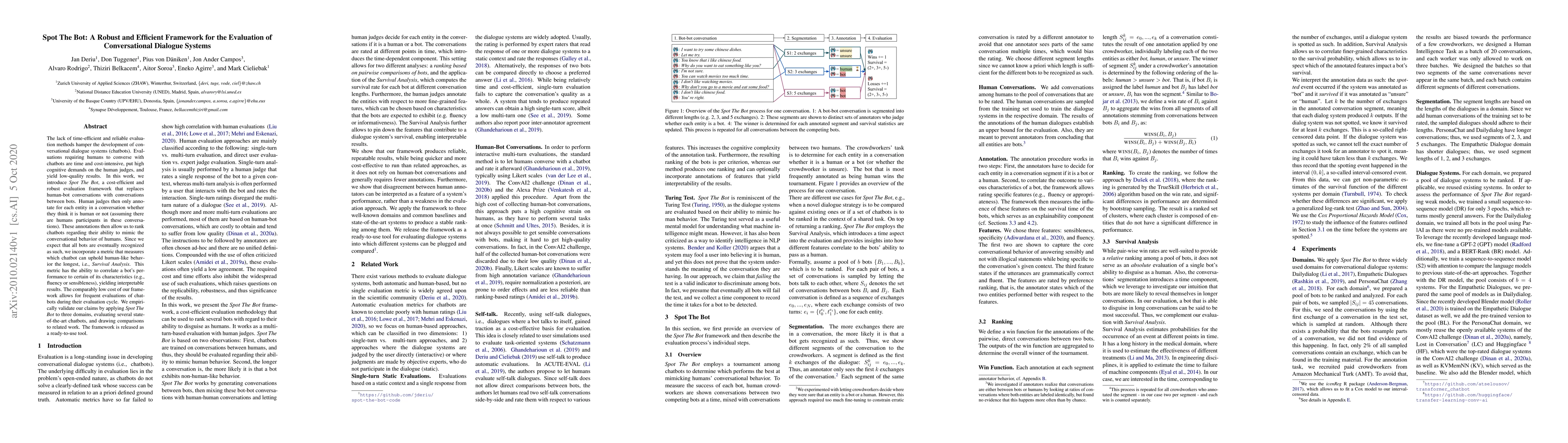The paper introduces "Spot The Bot," a cost-effective evaluation framework for conversational dialogue systems that uses bot-to-bot conversations and survival analysis to measure human-like behavior. This method reduces reliance on human judges and offers frequent, interpretable evaluation metrics.