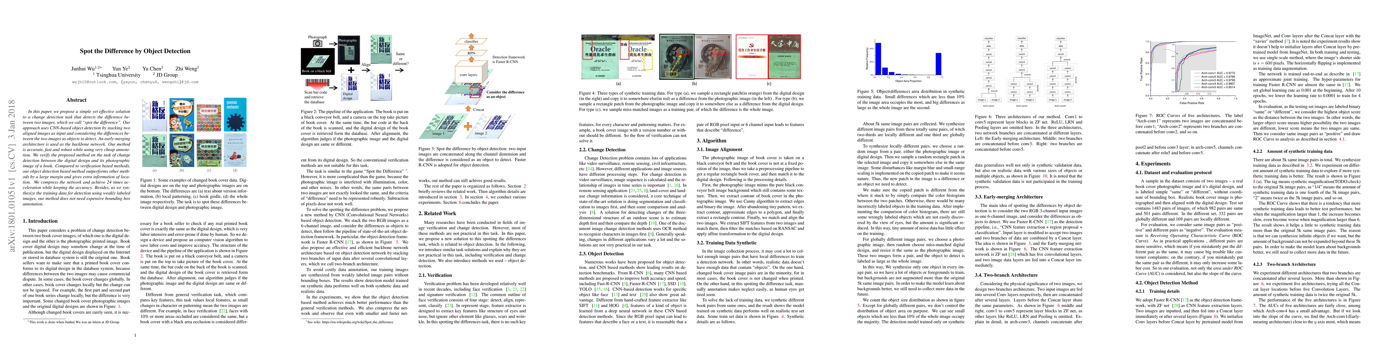 In this paper, we propose a simple yet effective solution to a change detection task that detects the difference between two images, which we call "spot the difference". Our approach uses CNN-based object detection by stacking two aligned images as input and considering the differences between the two images as objects to detect. An early-merging architecture is used as the backbone network. Our method is accurate, fast and robust while using very cheap annotation. We verify the proposed method on the task of change detection between the digital design and its photographic image of a book. Compared to verification based methods, our object detection based method outperforms other methods by a large margin and gives extra information of location. We compress the network and achieve 24 times acceleration while keeping the accuracy. Besides, as we synthesize the training data for detection using weakly labeled images, our method does not need expensive bounding box annotation.