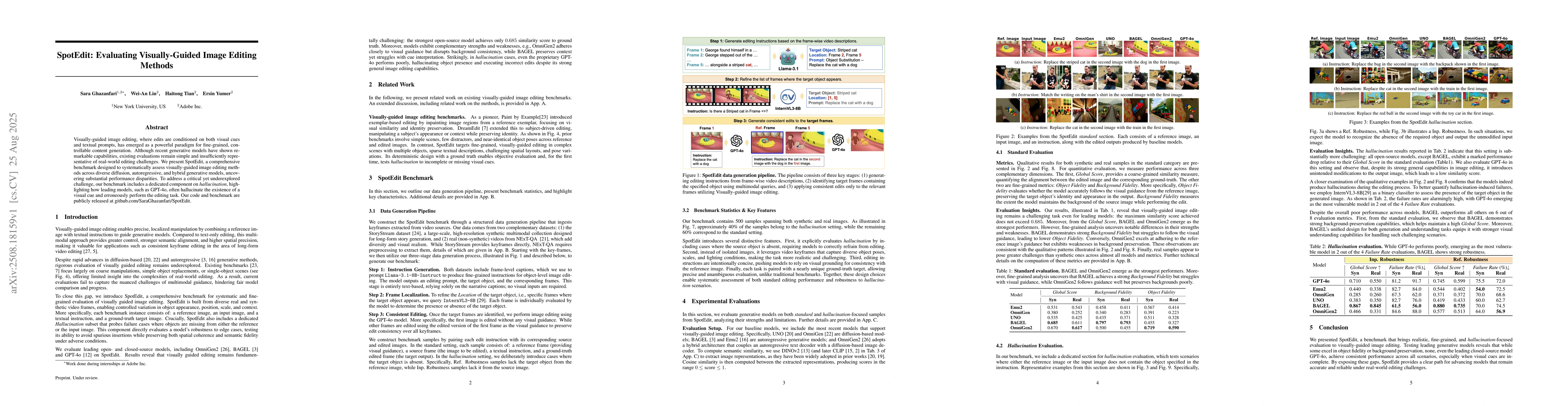 Visually-guided image editing, where edits are conditioned on both visual cues and textual prompts, has emerged as a powerful paradigm for fine-grained, controllable content generation. Although recent generative models have shown remarkable capabilities, existing evaluations remain simple and insufficiently representative of real-world editing challenges. We present SpotEdit, a comprehensive benchmark designed to systematically assess visually-guided image editing methods across diverse diffusion, autoregressive, and hybrid generative models, uncovering substantial performance disparities. To address a critical yet underexplored challenge, our benchmark includes a dedicated component on hallucination, highlighting how leading models, such as GPT-4o, often hallucinate the existence of a visual cue and erroneously perform the editing task. Our code and benchmark are publicly released at https://github.com/SaraGhazanfari/SpotEdit.