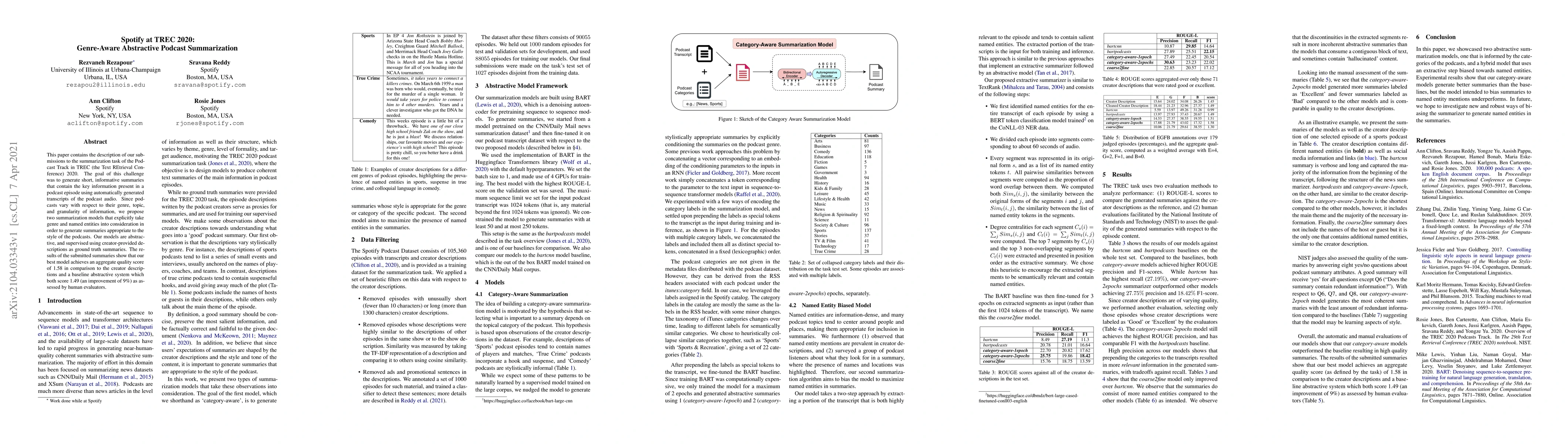 This paper contains the description of our submissions to the summarization task of the Podcast Track in TREC (the Text REtrieval Conference) 2020. The goal of this challenge was to generate short, informative summaries that contain the key information present in a podcast episode using automatically generated transcripts of the podcast audio. Since podcasts vary with respect to their genre, topic, and granularity of information, we propose two summarization models that explicitly take genre and named entities into consideration in order to generate summaries appropriate to the style of the podcasts. Our models are abstractive, and supervised using creator-provided descriptions as ground truth summaries. The results of the submitted summaries show that our best model achieves an aggregate quality score of 1.58 in comparison to the creator descriptions and a baseline abstractive system which both score 1.49 (an improvement of 9%) as assessed by human evaluators.