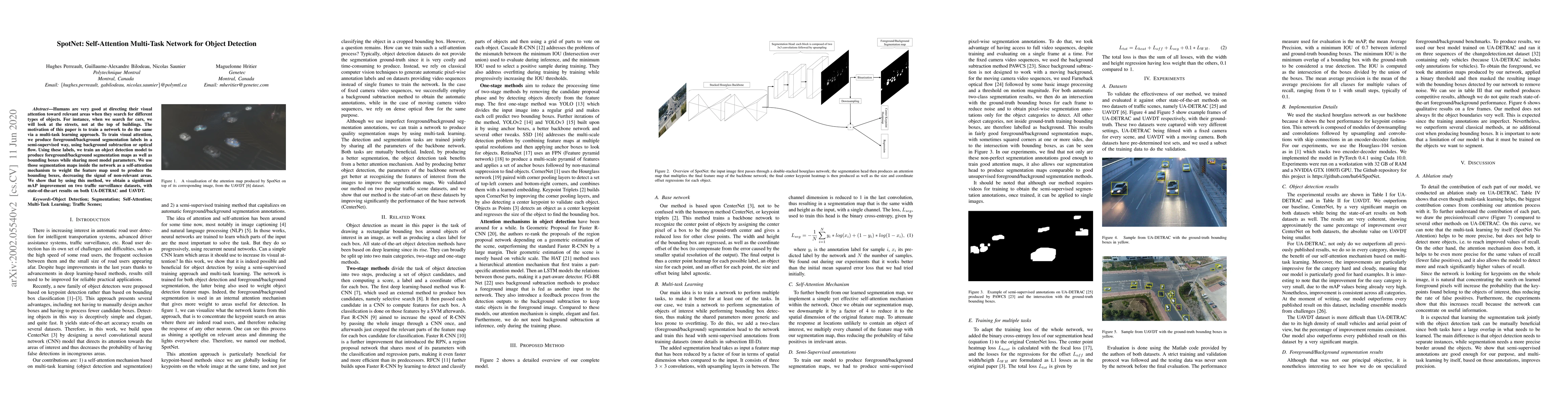 Humans are very good at directing their visual attention toward relevant areas when they search for different types of objects. For instance, when we search for cars, we will look at the streets, not at the top of buildings. The motivation of this paper is to train a network to do the same via a multi-task learning approach. To train visual attention, we produce foreground/background segmentation labels in a semi-supervised way, using background subtraction or optical flow. Using these labels, we train an object detection model to produce foreground/background segmentation maps as well as bounding boxes while sharing most model parameters. We use those segmentation maps inside the network as a self-attention mechanism to weight the feature map used to produce the bounding boxes, decreasing the signal of non-relevant areas. We show that by using this method, we obtain a significant mAP improvement on two traffic surveillance datasets, with state-of-the-art results on both UA-DETRAC and UAVDT.