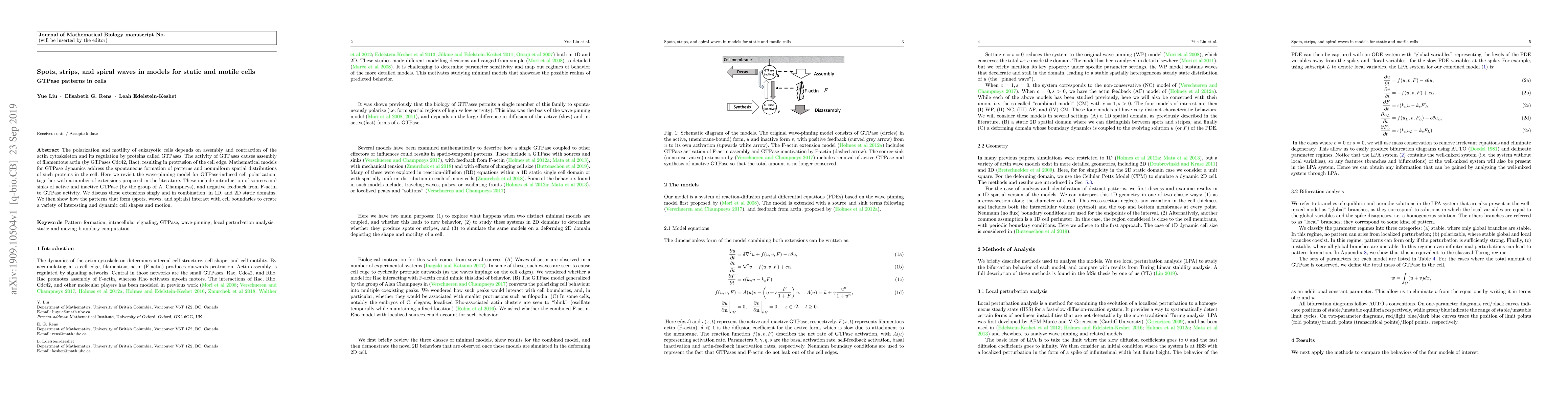 The polarization and motility of eukaryotic cells depends on assembly and contraction of the actin cytoskeleton and its regulation by proteins called GTPases. The activity of GTPases causes assembly of filamentous actin (by GTPases Cdc42, Rac), resulting in protrusion of the cell edge. Mathematical models for GTPase dynamics address the spontaneous formation of patterns and nonuniform spatial distributions of such proteins in the cell. Here we revisit the wave-pinning model for GTPase-induced cell polarization, together with a number of extensions proposed in the literature. These include introduction of sources and sinks of active and inactive GTPase (by the group of A. Champneys), and negative feedback from F-actin to GTPase activity. We discuss these extensions singly and in combination, in 1D, and 2D static domains. We then show how the patterns that form (spots, waves, and spirals) interact with cell boundaries to create a variety of interesting and dynamic cell shapes and motion.
