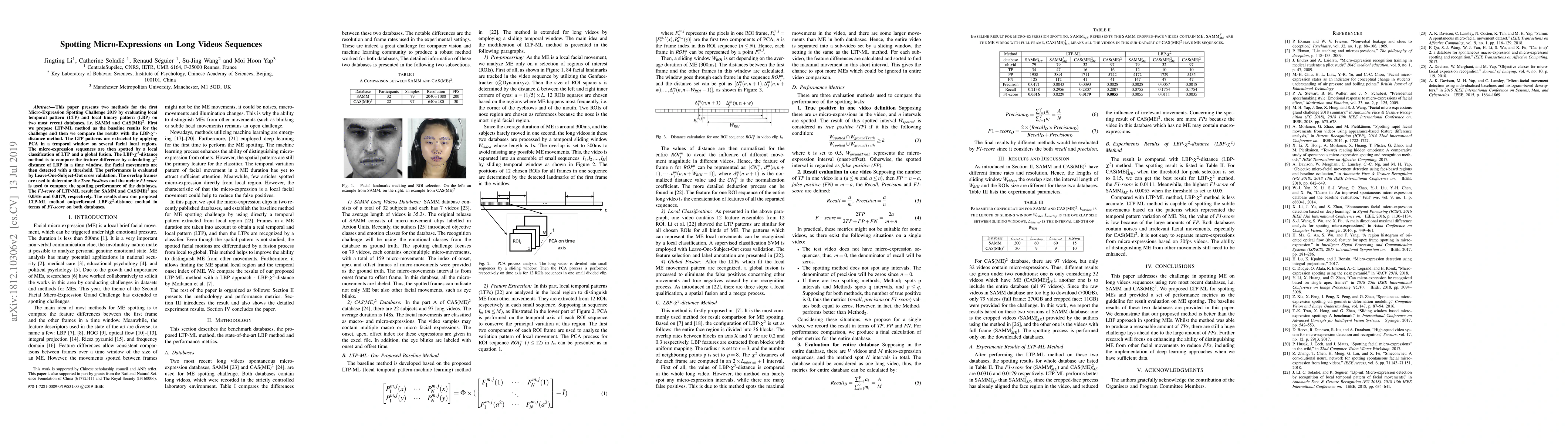 This paper introduces a method for spotting micro-expressions using local temporal patterns (LTP) extracted via PCA on facial regions, evaluated on SAMM and CAS(ME)2 datasets. The baseline results achieve F1-scores of 0.0316 and 0.0179, respectively, indicating initial performance in detecting micro-expressions.