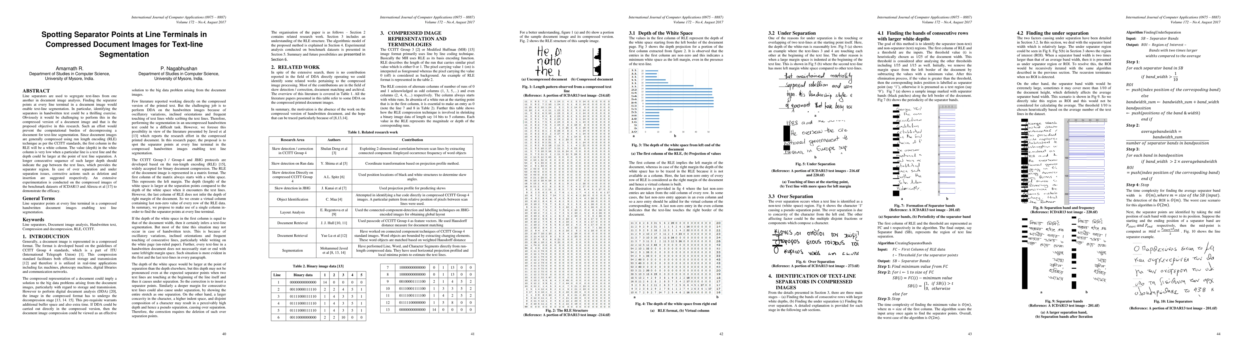 This research proposes a method to identify separator points at line terminals in compressed document images for text-line segmentation, aiming to avoid the computational cost of decompression. It leverages run length encoding (RLE) to detect gaps between text lines based on depth variations in the first column, with corrective actions for over and under separation.