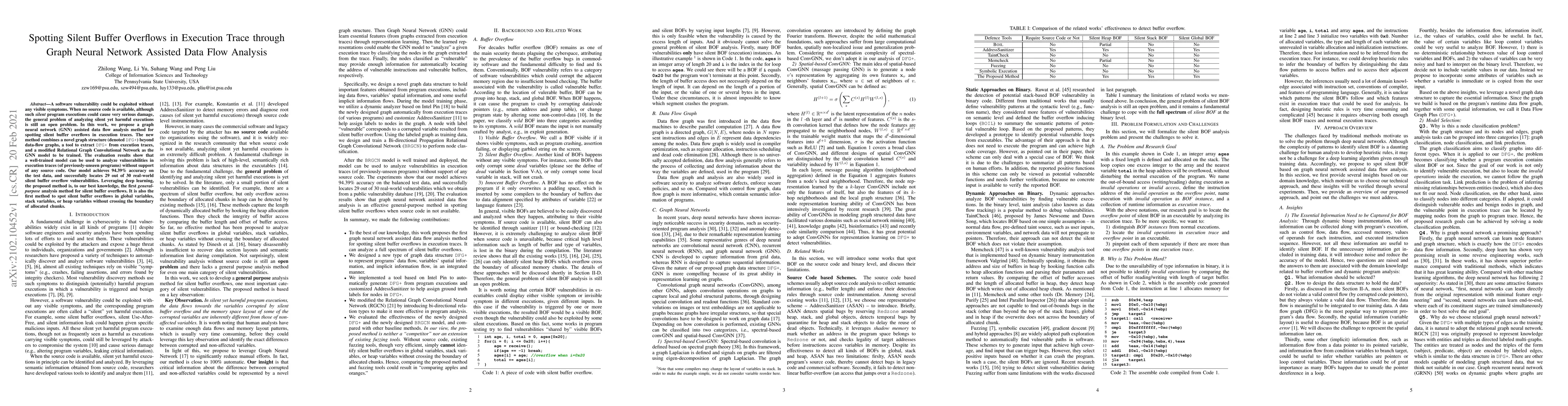 This paper proposes a graph neural network (GNN) assisted data flow analysis method to detect silent buffer overflows in execution traces without source code. The method combines a novel graph structure (DFG+), a tool to extract it, and a modified Relational Graph Convolutional Network, achieving 94.39% accuracy and successfully identifying 29 out of 30 real-world silent buffer overflow vulnerabilities.