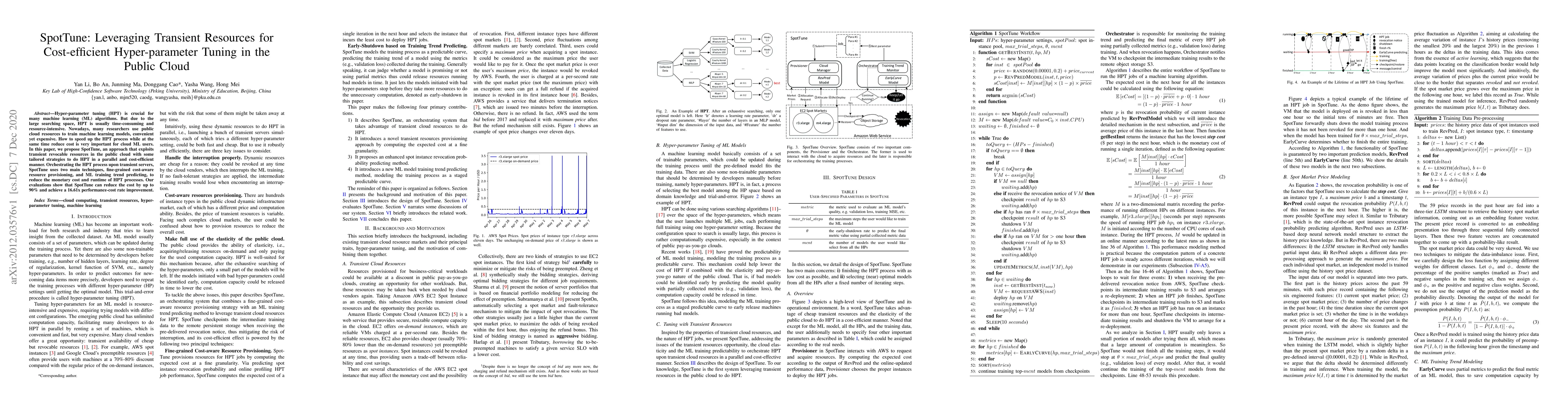 SpotTune proposes a method to leverage transient, revocable resources in the public cloud for cost-efficient hyper-parameter tuning in machine learning. It employs fine-grained cost-aware provisioning and ML training trend prediction to significantly reduce costs and runtime, achieving a 90% cost reduction and a 16.61x performance-cost rate improvement.