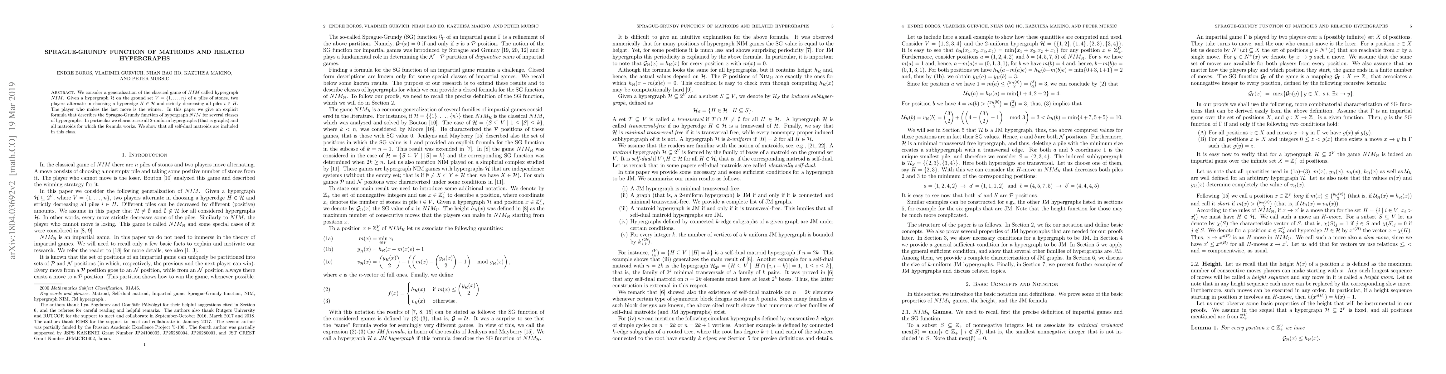 We consider a generalization of the classical game of $NIM$ called hypergraph $NIM$. Given a hypergraph $\cH$ on the ground set $V = \{1, \ldots, n\}$ of $n$ piles of stones, two players alternate in choosing a hyperedge $H \in \cH$ and strictly decreasing all piles $i\in H$. The player who makes the last move is the winner. In this paper we give an explicit formula that describes the Sprague-Grundy function of hypergraph $NIM$ for several classes of hypergraphs. In particular we characterize all $2$-uniform hypergraphs (that is graphs) and all matroids for which the formula works. We show that all self-dual matroids are included in this class.