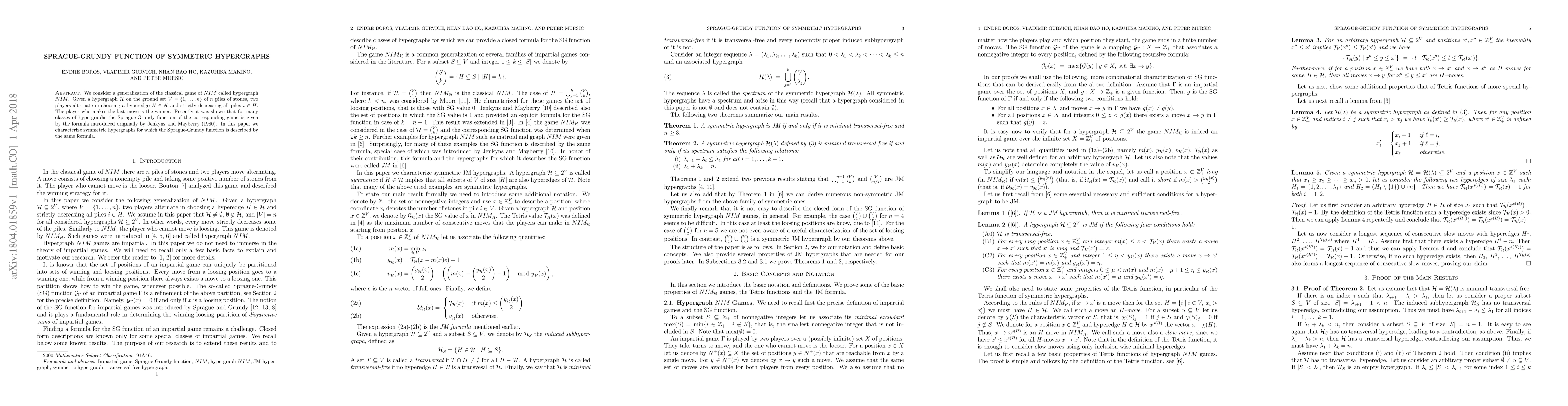 This paper generalizes the NIM game to hypergraph NIM, where players choose hyperedges to decrease piles, and explores the Sprague-Grundy function for symmetric hypergraphs. It characterizes symmetric hypergraphs where the Sprague-Grundy function adheres to a specific formula introduced by Jenkyns and Mayberry in 1980.