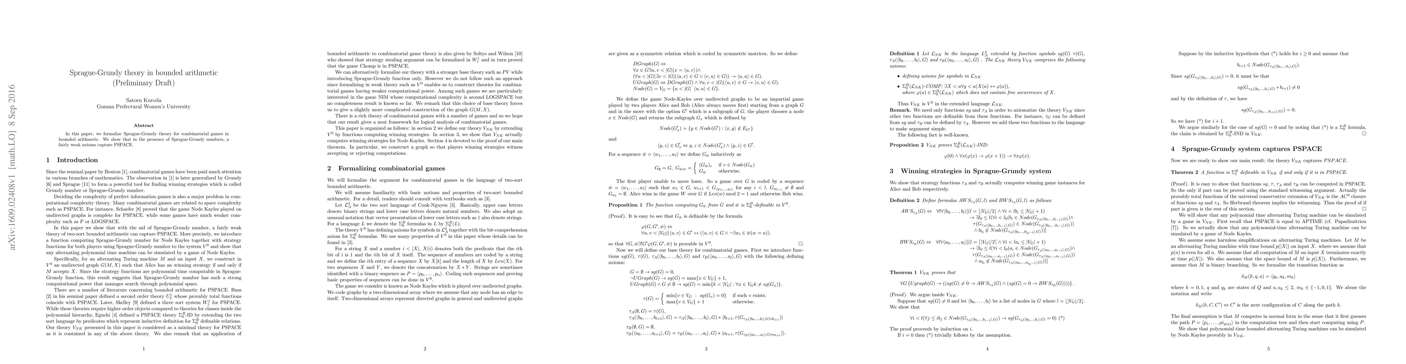 This paper formalizes Sprague-Grundy theory within bounded arithmetic, demonstrating that weak axioms in this framework can capture PSPACE complexity when Sprague-Grundy numbers are involved.