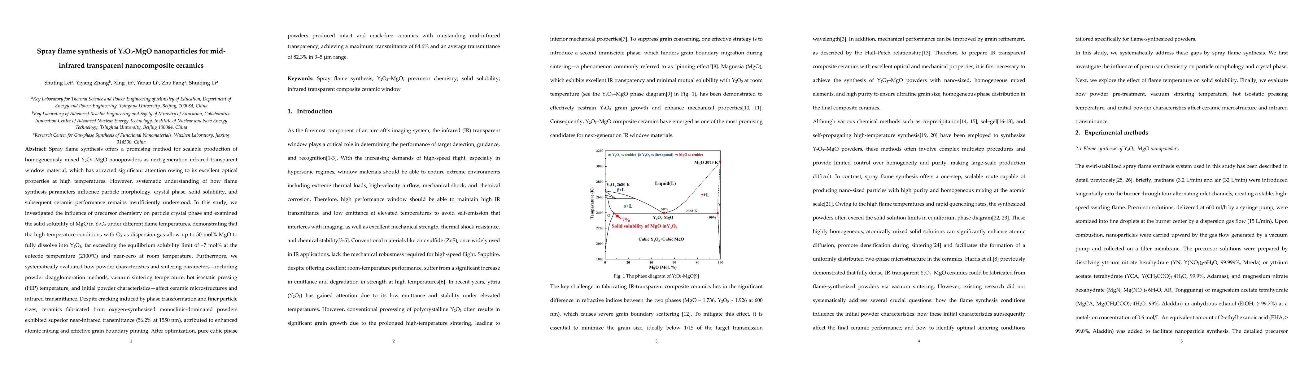 Spray flame synthesis offers a promising method for scalable production of homogeneously mixed Y2O3-MgO nanopowders as next-generation infrared-transparent window material, which has attracted significant attention owing to its excellent optical properties at high temperatures. However, systematic understanding of how flame synthesis parameters influence particle morphology, crystal phase, solid solubility, and subsequent ceramic performance remains insufficiently understood. In this study, we investigated the influence of precursor chemistry on particle crystal phase and examined the solid solubility of MgO in Y2O3 under different flame temperatures, demonstrating that the high-temperature conditions with O2 as dispersion gas allow up to 50 mol% MgO to fully dissolve into Y2O3, far exceeding the equilibrium solubility limit of 7 mol% at the eutectic temperature (2100{\deg}C) and near-zero at room temperature. Furthermore, we systematically evaluated how powder characteristics and sintering parameters-including powder deagglomeration methods, vacuum sintering temperature, hot isostatic pressing (HIP) temperature, and initial powder characteristics-affect ceramic microstructures and infrared transmittance. Despite cracking induced by phase transformation and finer particle sizes, ceramics fabricated from oxygen-synthesized monoclinic-dominated powders exhibited superior near-infrared transmittance (56.2% at 1550 nm), attributed to enhanced atomic mixing and effective grain boundary pinning. After optimization, pure cubic phase powders produced intact and crack-free ceramics with outstanding mid-infrared transparency, achieving a maximum transmittance of 84.6% and an average transmittance of 82.3% in 3-5 um range.