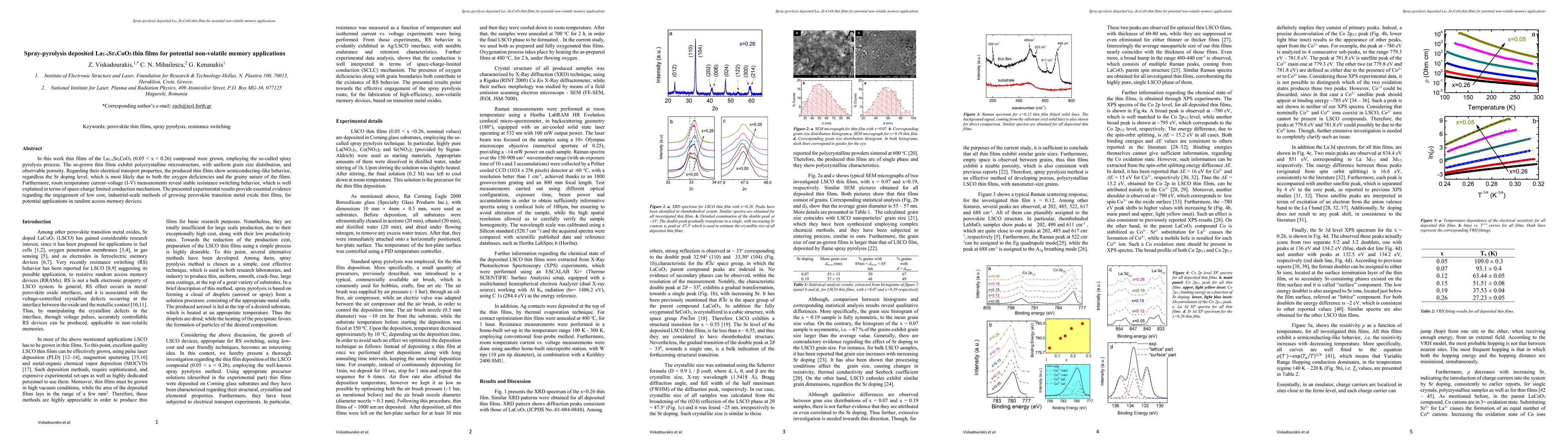 This study investigates La1-xSrxCoO3 thin films deposited via spray pyrolysis, showing semiconducting behavior and stable resistance switching at room temperature, suggesting their potential for non-volatile memory applications in random access memory devices.