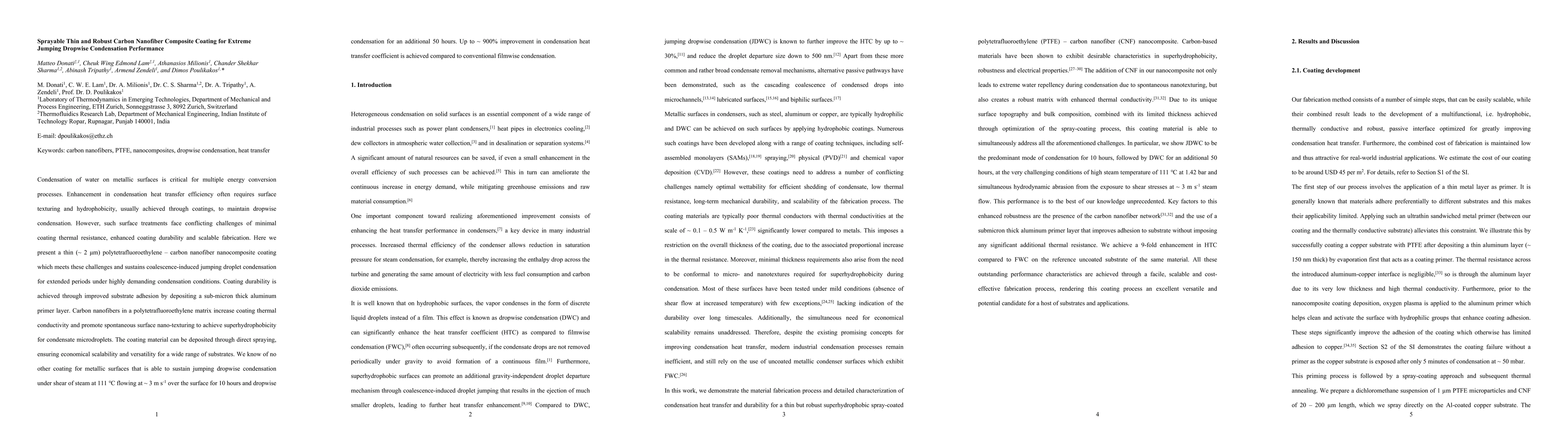 The research presents a sprayable thin and robust carbon nanofiber composite coating for extreme jumping dropwise condensation performance. The coating, consisting of a polytetrafluoroethylene matrix with carbon nanofibers, is deposited via direct spraying, ensuring scalability and versatility. A sub-micron thick aluminum primer layer enhances coating durability by improving substrate adhesion.